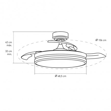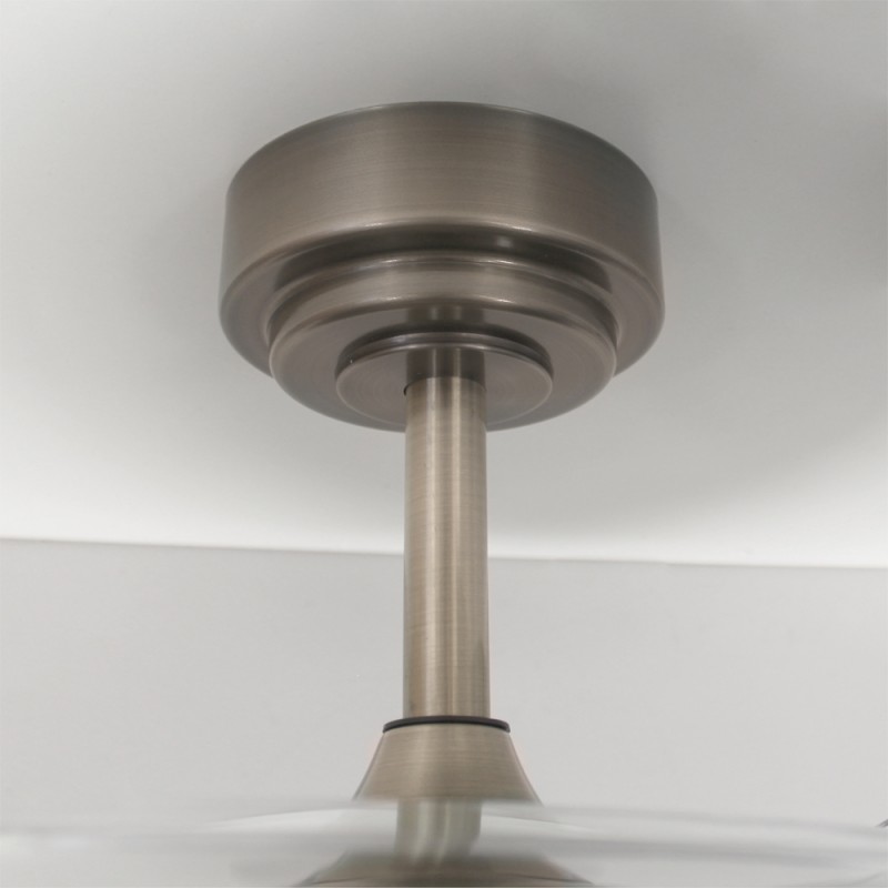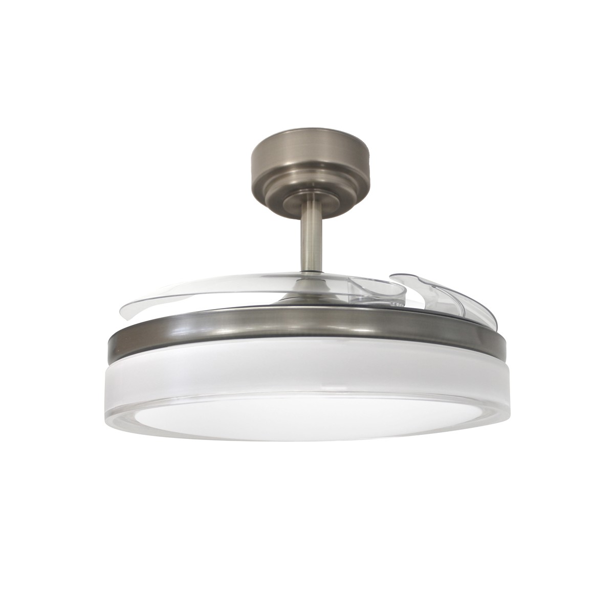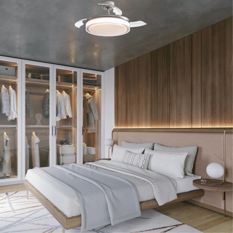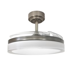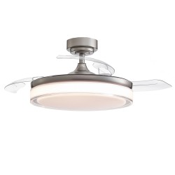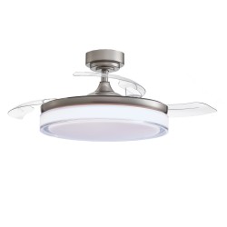 Aneto ceiling fan with retractable blades. Bring ample airflow into your bedroom or living room with this ultra-quiet fan with six rotation speeds. The fan has an integrated 72W LED light which allows to solve the main lighting of the room. The fan blades are retractable, allowing the fan to be used as a ceiling light when not in use. Includes remote control to control both the lighting and the rotation speed and functions of the fan. Three colour temperatures, power-on memory, reverse rotation function and timer. Níckel ceiling fan with transparent blades.