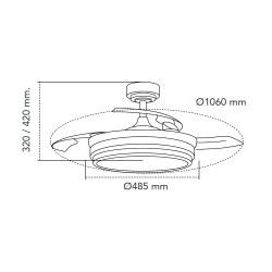 Lander ceiling fan with folding blades. Ultra-quiet fan with six rotation speeds, reverse function and timer. It has retractable blades so that they remain retracted over the motor when the fan is not in operation. You can regulate the colour tone and dim the intensity of the lighting with the remote control. Black ceiling fan with transparent folding blades made of PC. Recommended for room sizes between 13 and 20 m3.