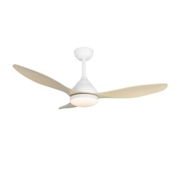 Quiet Nordic style ceiling fan. Integrated LED lighting adjustable in intensity and colour temperature. With silent DC motor operates at 6 different speeds and includes 1-2-4h timer and summer-winter function. Switch-on memory with the last lighting configuration. Includes remote control to control fan and lighting. White motor and light wood-coloured ABS blades.