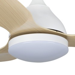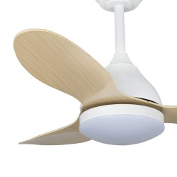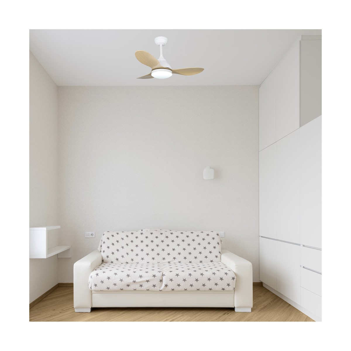 Silent ceiling fan for small rooms. Integrated LED lighting adjustable in intensity and colour temperature. With silent DC motor operates at 6 different speeds and includes 1-2-4h timer and summer-winter function. Switch-on memory with the last lighting configuration. Includes remote control to control fan and lighting. Nordic style design with white structure and three light wood-coloured ABS blades.