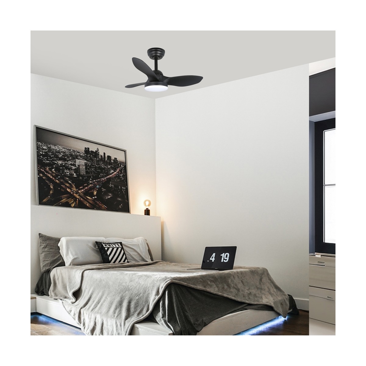 Stel Mini S silent ceiling fan. Integrated LED lighting adjustable in intensity and colour temperature. With silent DC motor operates at 6 different speeds and includes 1-2-4h timer and summer-winter function. Switch-on memory with the last lighting configuration. Includes remote control to control fan and lighting. Modern style in black with a diameter of 80 centimetres, designed for ceiling installation in small rooms and bedrooms.