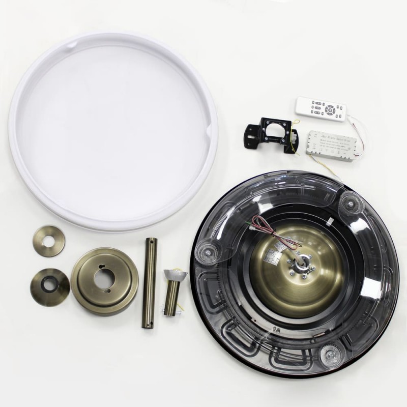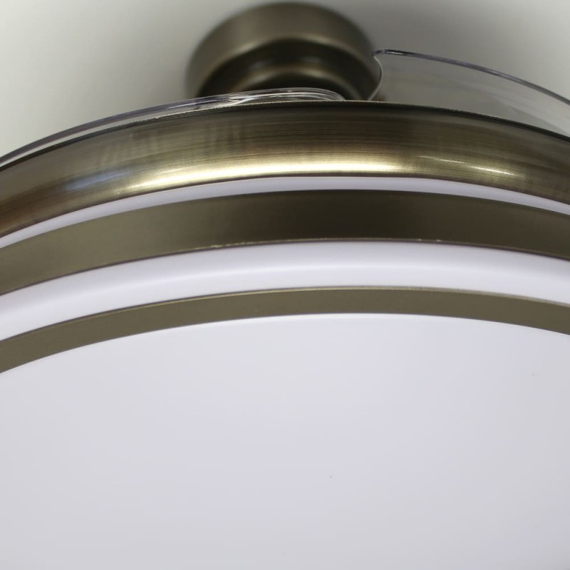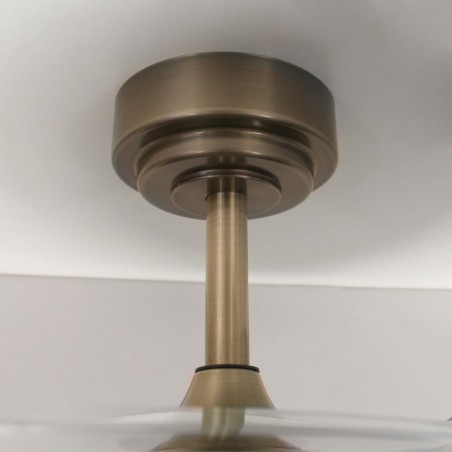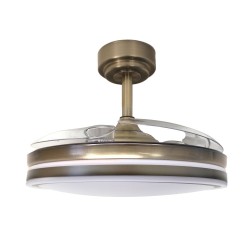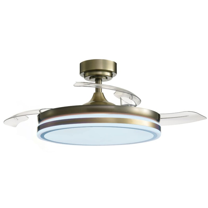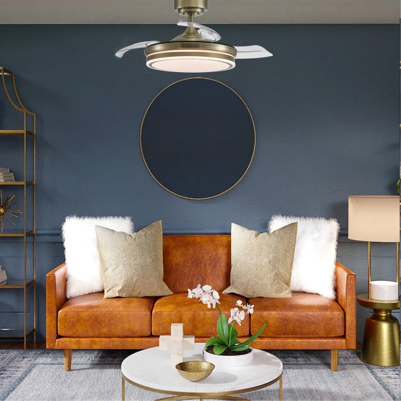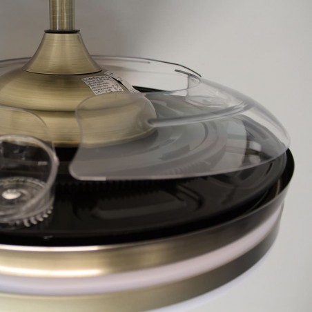 LED ceiling fan Moss with retractable blades. Vintage style, antic brass finish fan with a practical design that allows both ventilation and illumination of the room. It has integrated LED lighting with dimmable lumens intensity and three colour temperatures (3000-4000-6000K). In addition, with the remote control you can select the breeze function, a night light mode or set the fan to switch off after 2-4 hours. Ultra-quiet DC motor with six rotation speeds and winter-summer reverse function. Leather finish fan with transparent blades.