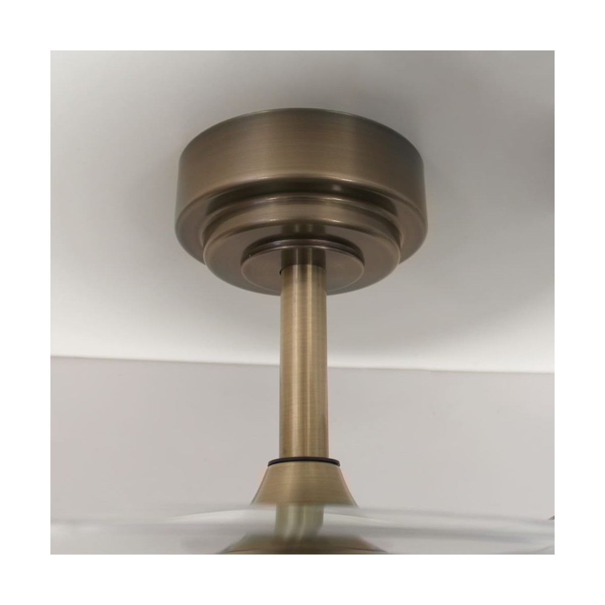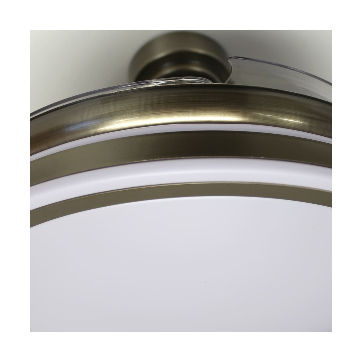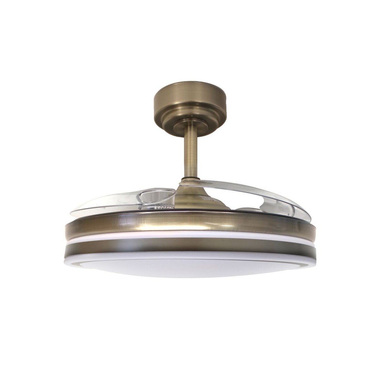 LED ceiling fan Moss with retractable blades. Vintage style, antic brass finish fan with a practical design that allows both ventilation and illumination of the room. It has integrated LED lighting with dimmable lumens intensity and three colour temperatures (3000-4000-6000K). In addition, with the remote control you can select the breeze function, a night light mode or set the fan to switch off after 2-4 hours. Ultra-quiet DC motor with six rotation speeds and winter-summer reverse function. Leather finish fan with transparent blades.