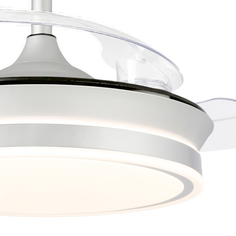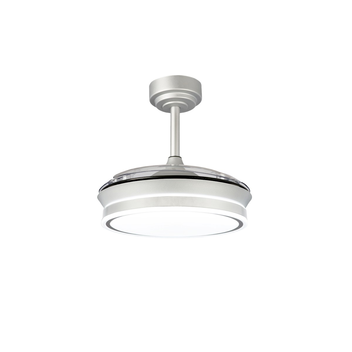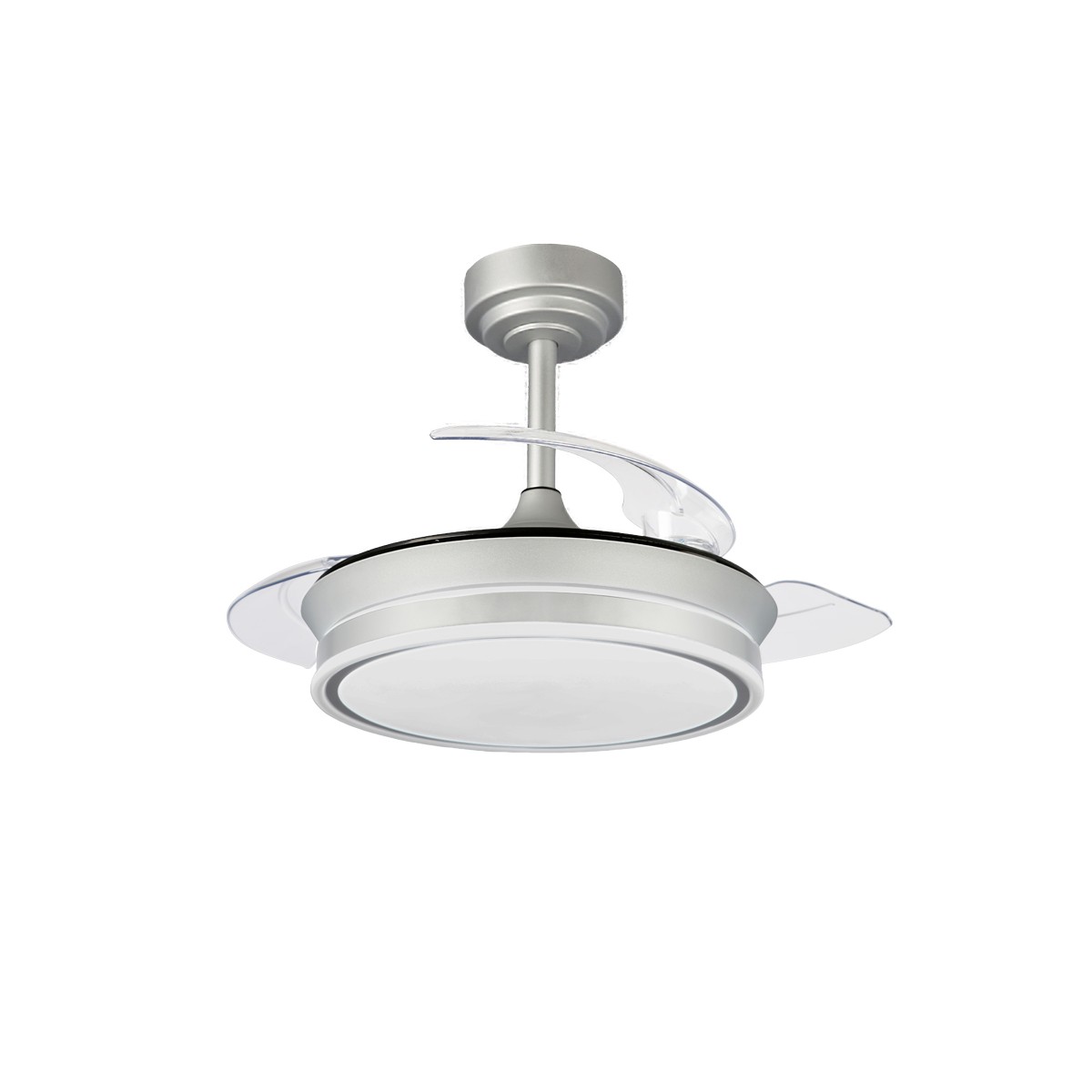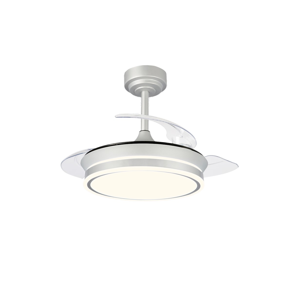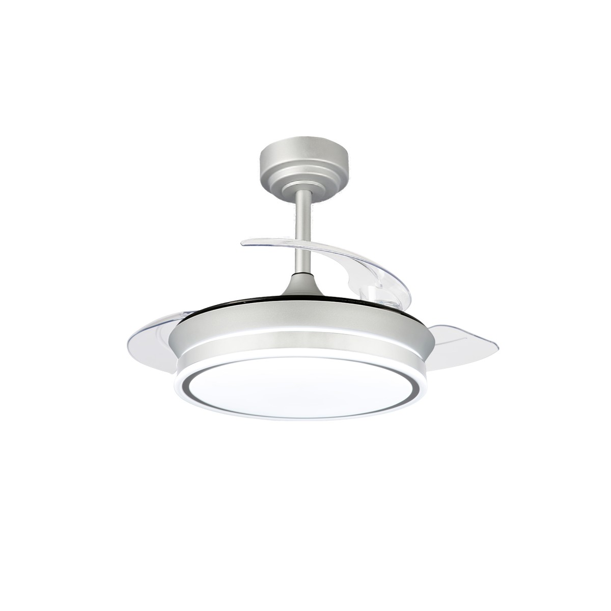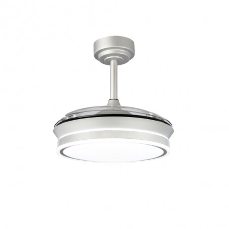 LED Mini Moss ceiling fan for small rooms. Ceiling fan with retractable blades designed to provide airflow and lighting in bedrooms and small living rooms. It has an ultra-quiet motor with 6 rotation speeds, reverse winter-summer function, timer and breeze function. As for the lighting, you can set three lighting tones (warm, neutral or cold) and dim the intensity of lumens. The body of the fan is grey and the folding blades are transparent.
