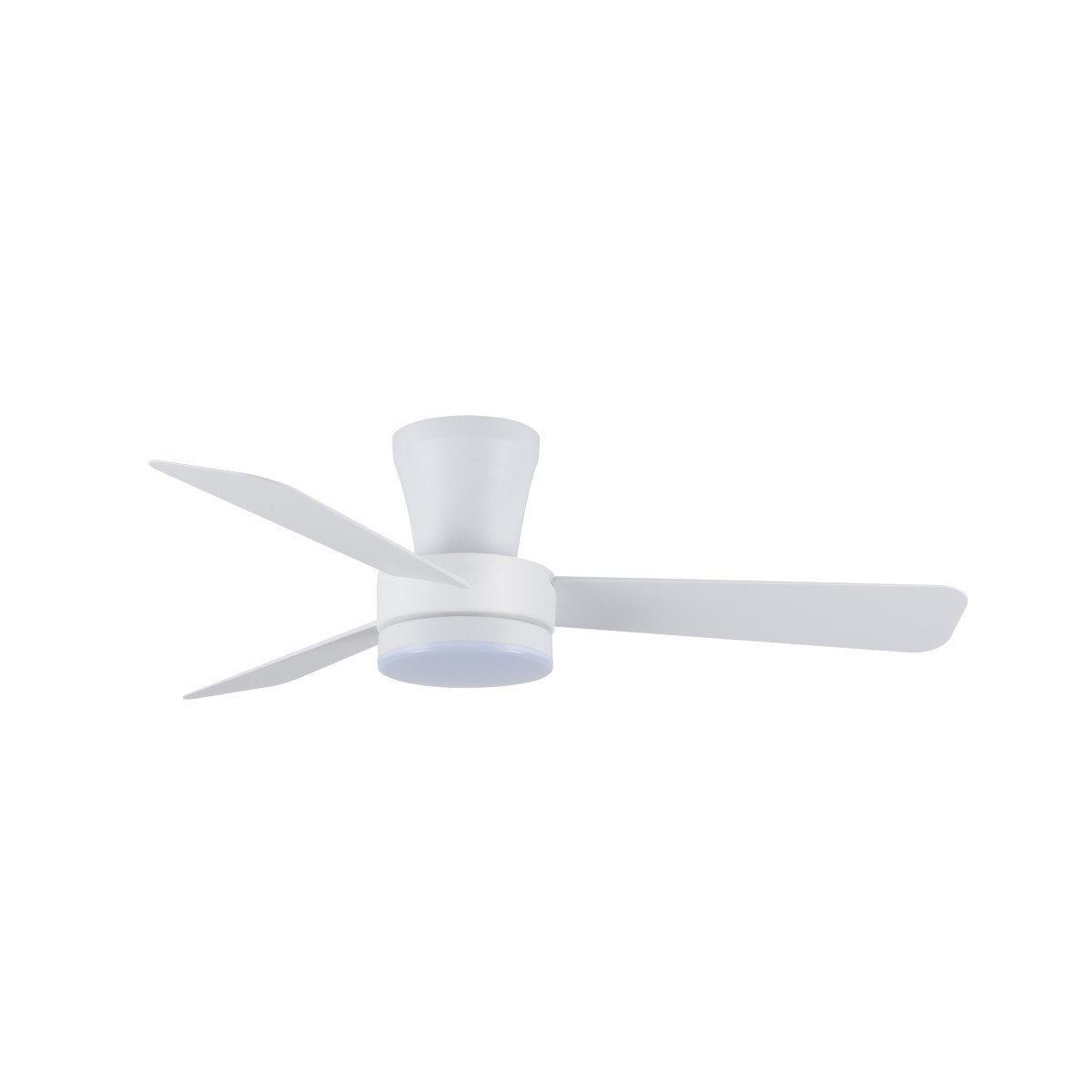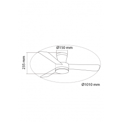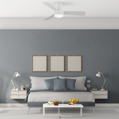Ceiling fan with LED light for medium sized rooms. Ceiling fan with three blades designed for bedrooms and rooms of 13-20 square metres. LED lighting adjustable in intensity and colour temperature. The motor is DC so it emits very little noise and has six rotation speeds. Silent white fan with three ABS blades. Remote control included.