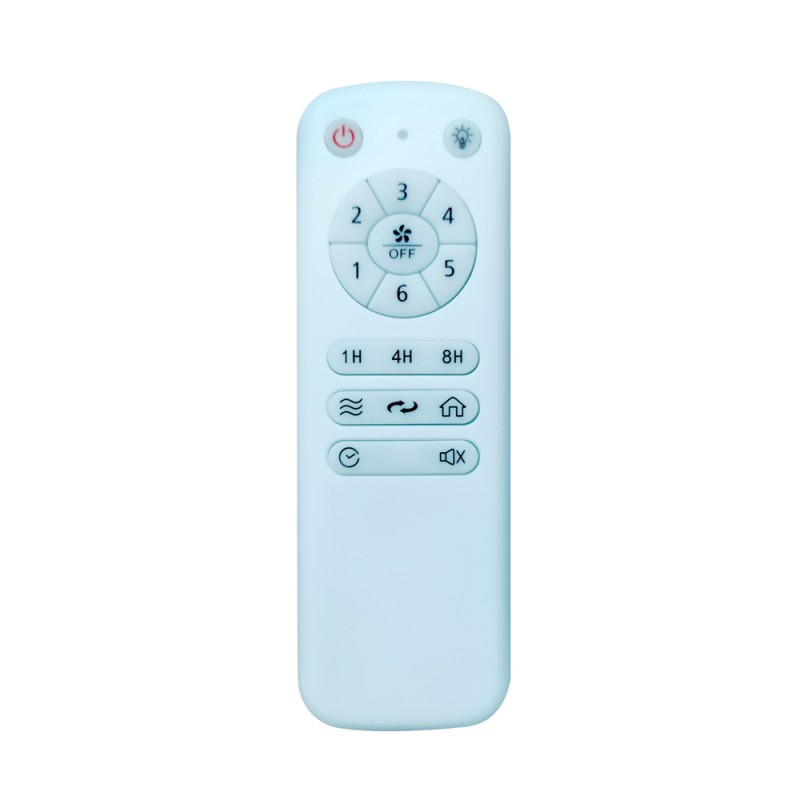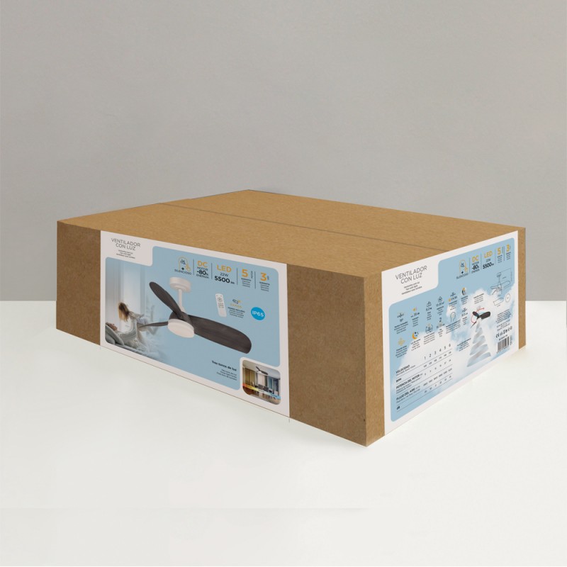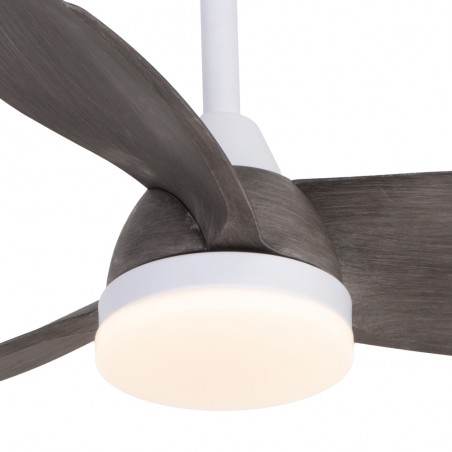 Byan ceiling fan suitable for outdoor use. Small, silent fan, very practical for balconies, terraces and porches. DC motor with six rotation speeds, reverse function and timer to program its shutdown. It has integrated LED lighting adjustable in colour temperature and lumen intensity. White steel motor and three ash grey wood-effect ABS blades. IP65.