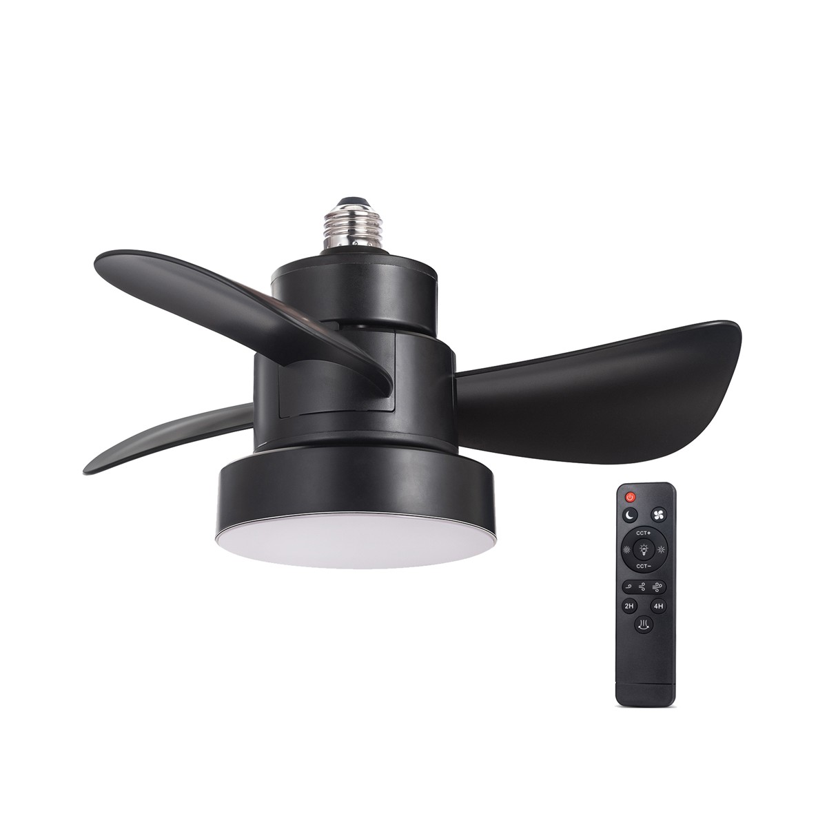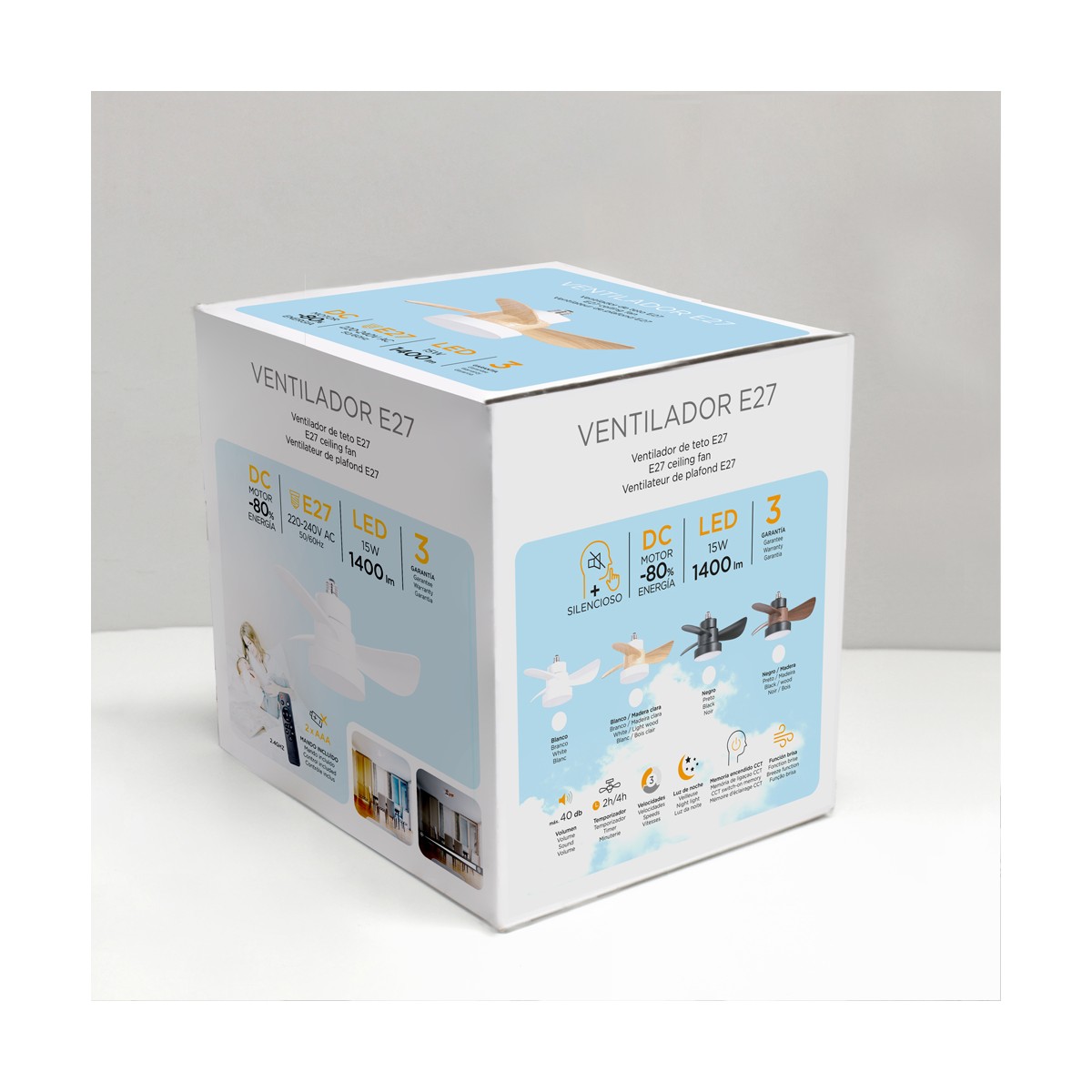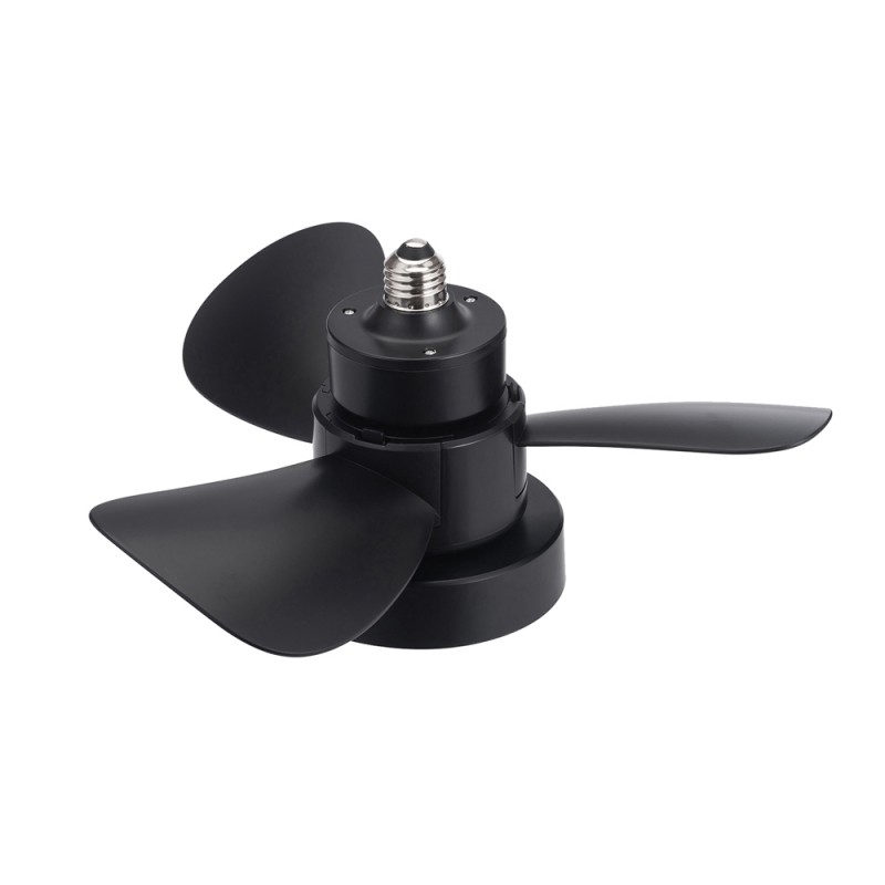 Fan with E27 screw Bayad. Compact three-speed fan designed to fit in a lamp holder or E27 base. Very practical to provide a pleasant air flow in any place. In addition, it has integrated 15W LED lighting adjustable in intensity and colour temperature. Black fan.