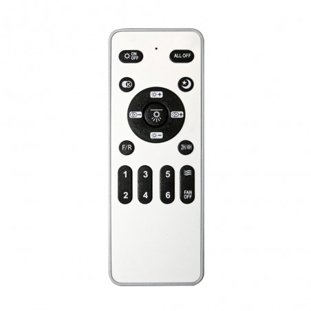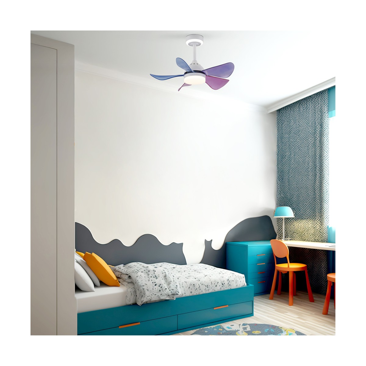 Ceiling fan for children's rooms. Small fan with five coloured blades ideal for placing on the ceilings of children's rooms. It provides a pleasant air flow and emits very little noise during operation thanks to its DC motor. In addition, it has LED lighting adjustable in colour temperature and lumen intensity. The fan is white with five polycarbonate blades in blue, purple and magenta. Timer, reverse rotation function and power-on memory. Remote control included.