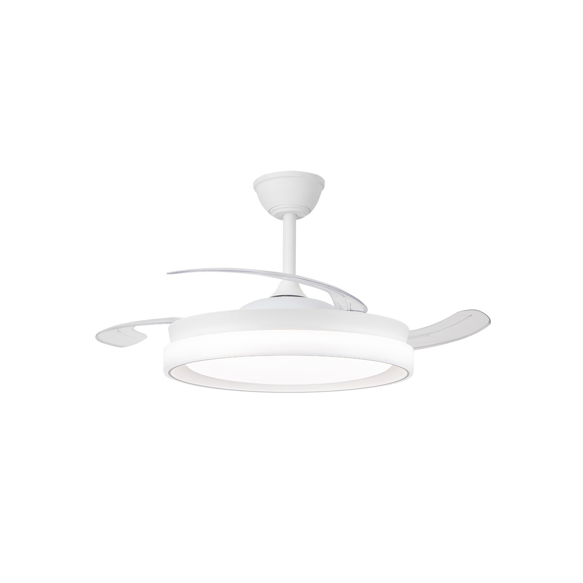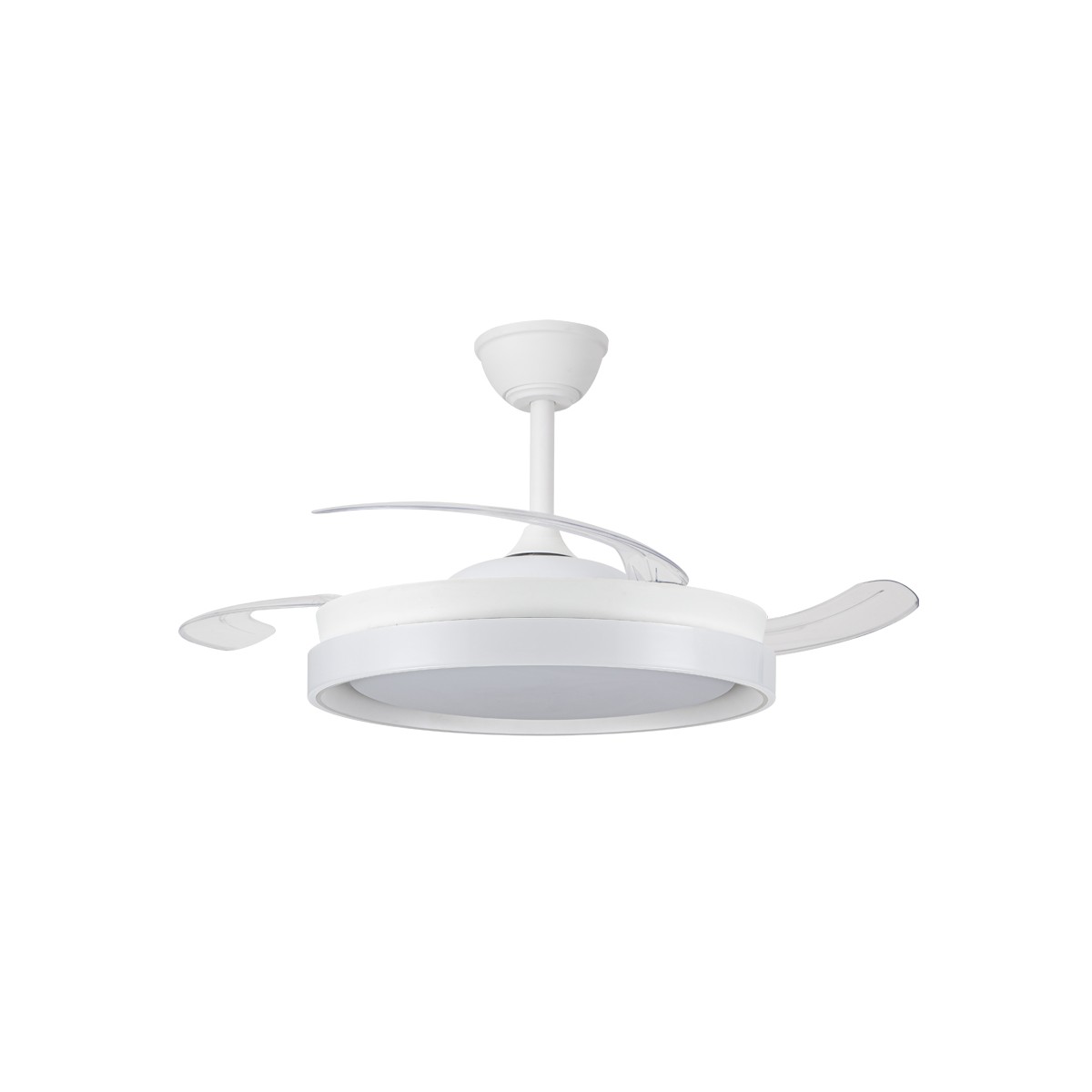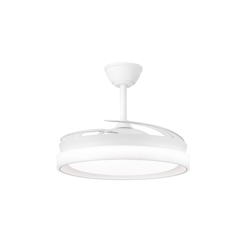 Silent fan for bedrooms. White fan with retractable blades specially designed for bedrooms and living rooms. Its six-speed DC motor emits minimal noise when the fan is in operation. It has energy-saving LED lighting and can be easily adjusted with the remote control. Reverse function winter-summer, timer and colour memory. Silent fan with retractable blades.