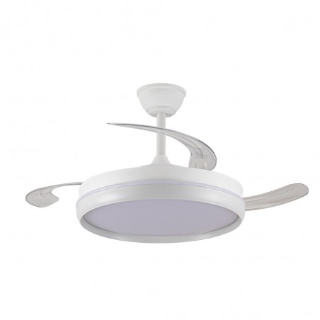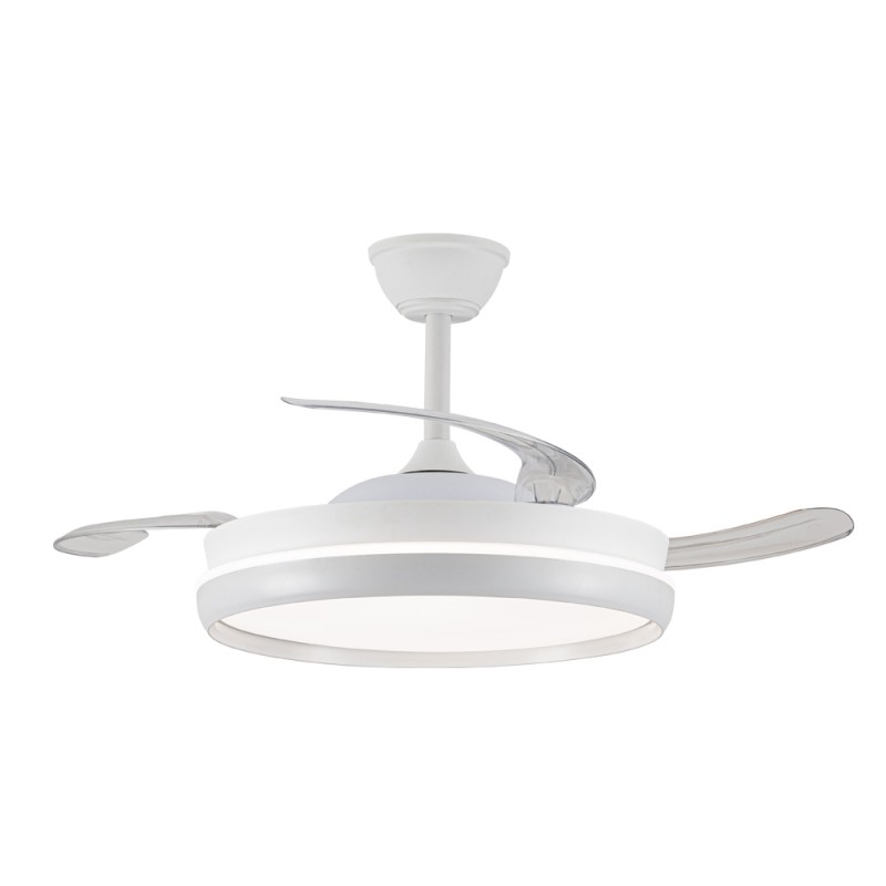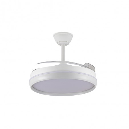 Silent fan for bedrooms. White fan with retractable blades specially designed for bedrooms and living rooms. Its six-speed DC motor emits minimal noise when the fan is in operation. It has energy-saving LED lighting and can be easily adjusted with the remote control. Reverse function winter-summer, timer and colour memory. Silent fan with retractable blades.