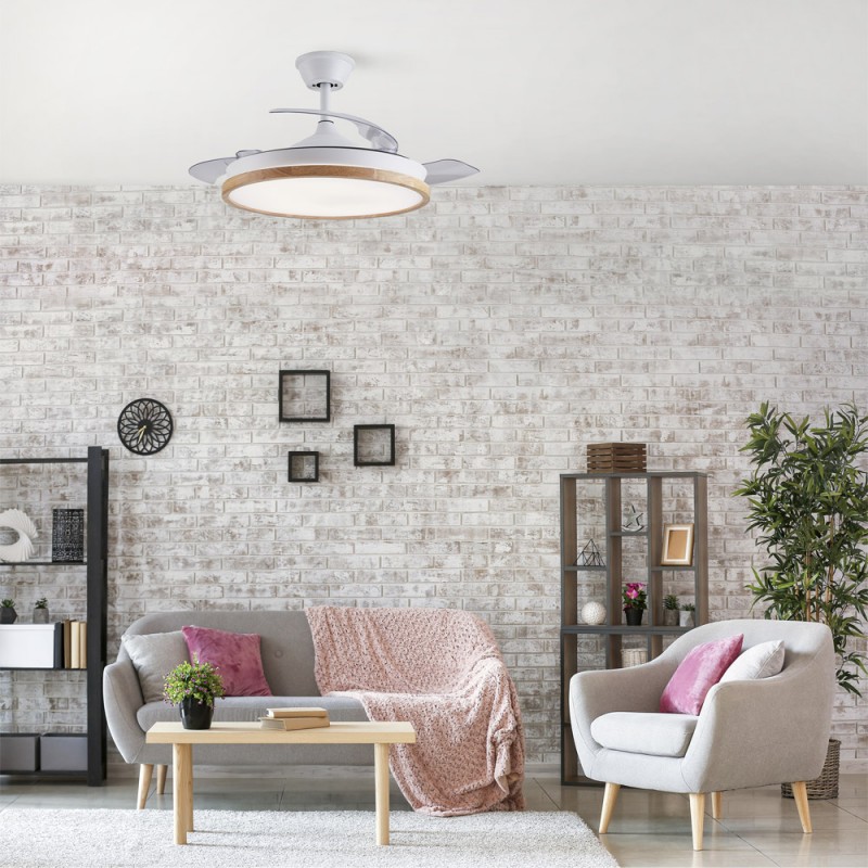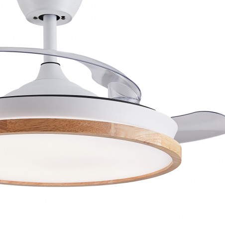 Silent fan for bedrooms. White fan with retractable blades specially designed for bedrooms and living rooms. Nordic style design combining the steel structure with a piece of natural wood. Its six-speed DC motor emits minimal noise when the fan is running. It has energy-saving LED lighting and can be easily adjusted with the remote control. Reverse function winter-summer, timer and colour memory. Remote control included.
