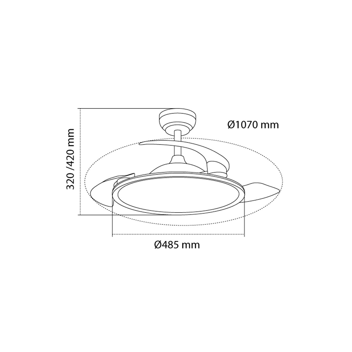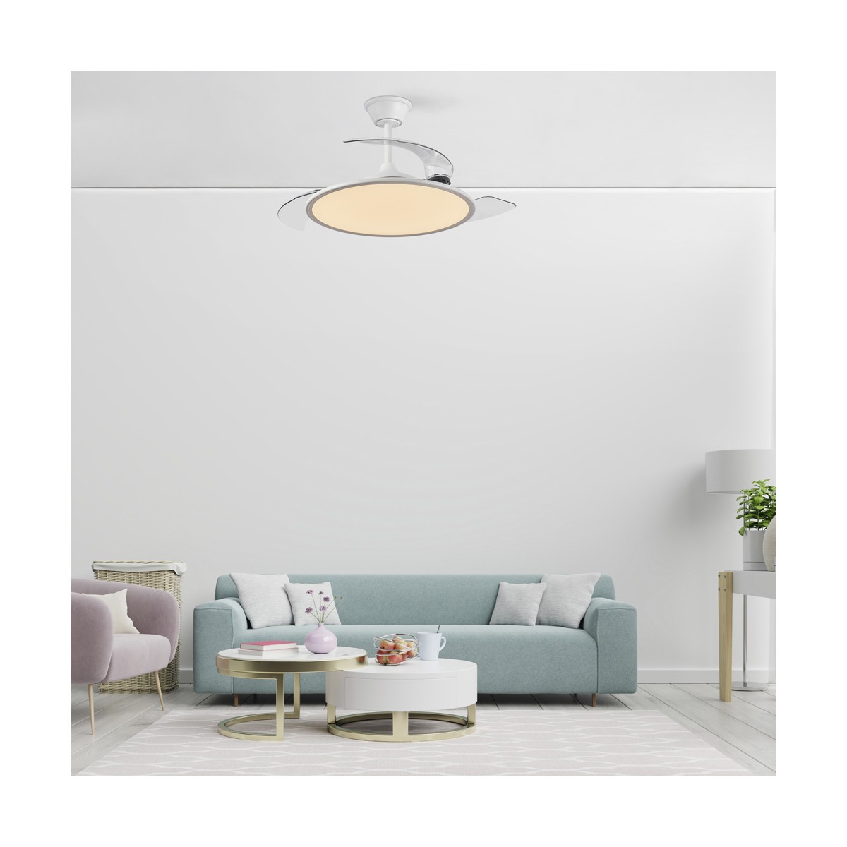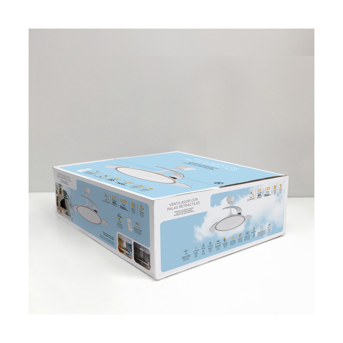 Trident LED ceiling fan with retractable blades. Modern white fan with a minimalist and practical design, designed both to provide ventilation and to illuminate the room. It has integrated LED lighting with dimmable lumens intensity and three colour temperatures (3000-4000-6000K). In addition, with the remote control you can select the breeze function, a night light mode or set the fan to turn off after 2-4 hours. Its design with a diameter of 107 cm with the blades deployed makes it ideal for rooms of 13-20 square metres. Diffuser with a diameter of 48.50 centimetres. Ultra-quiet DC motor with six rotation speeds and winter-summer reverse function.
