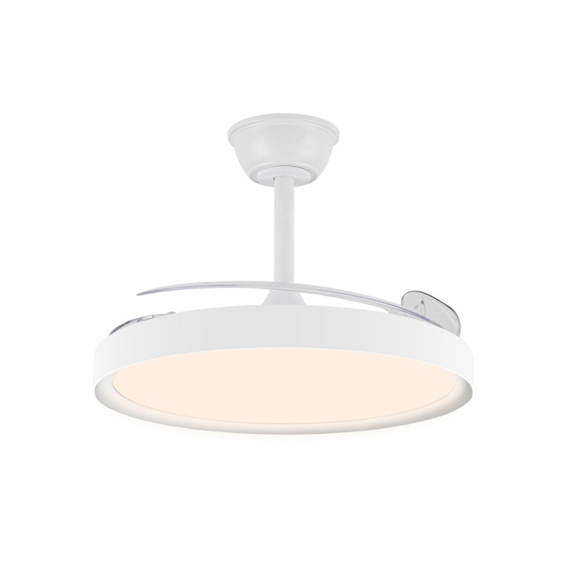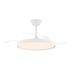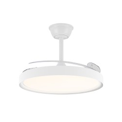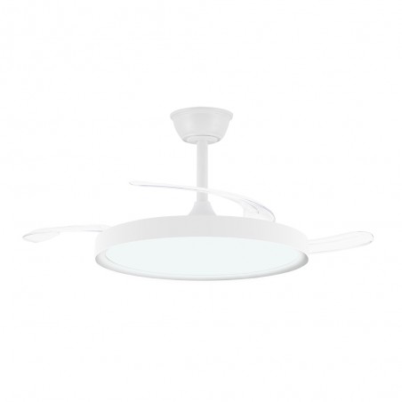 Lamp fan with silent motor Polaris. White fan with retractable blades, ideal for bedrooms and living rooms (13-20 m2). Minimalist design in white finish, with steel motor, polycarbonate blades and PMMA diffuser. Its six-speed DC motor emits minimum noise when the fan is in operation. It has energy-saving LED lighting which you can regulate in both intensity and colour tone. It has an inverted winter-summer function, timer and colour memory. Remote control included.