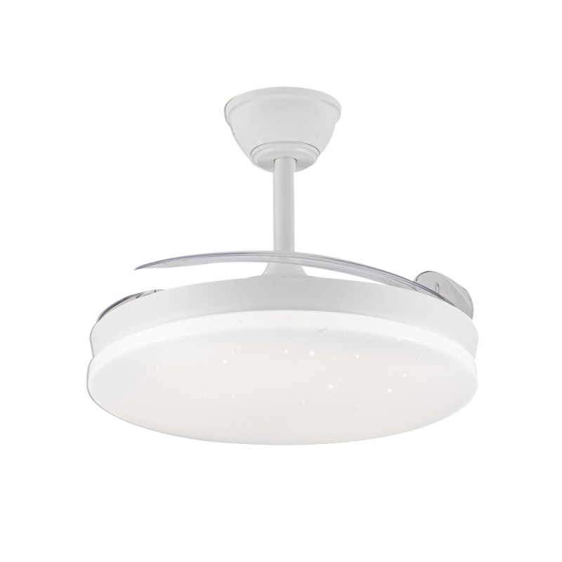 Stars Evo silent fan for bedrooms. White fan with retractable blades, designed with a PMMA diffuser with a decorative star effect. Its six-speed DC motor emits minimal noise when the fan is running. It features LED lighting adjustable in intensity and colour tone, inverted winter-summer function, timer and colour memory. You can control the fan with the remote control or with your smartphone via app.