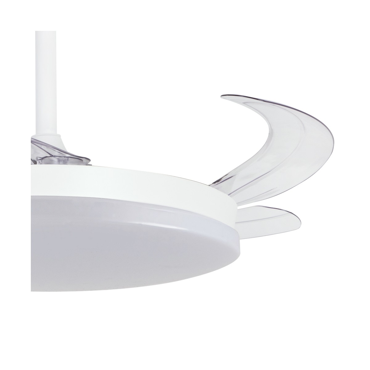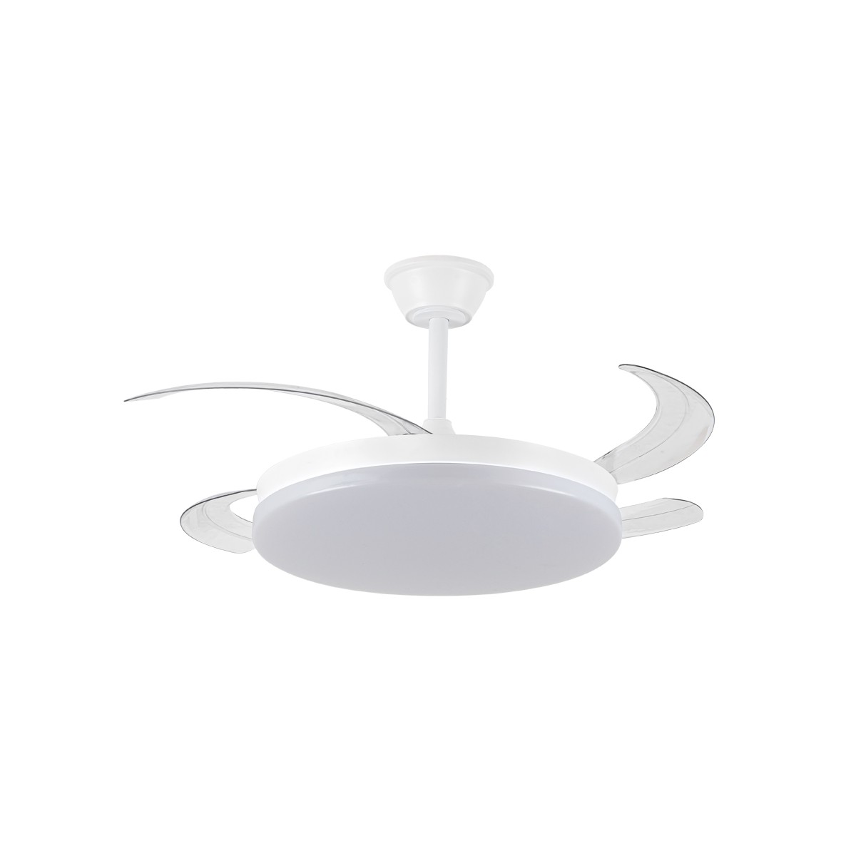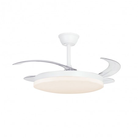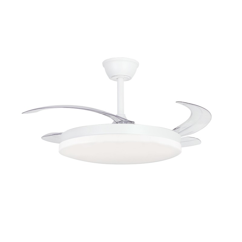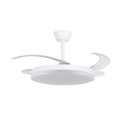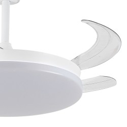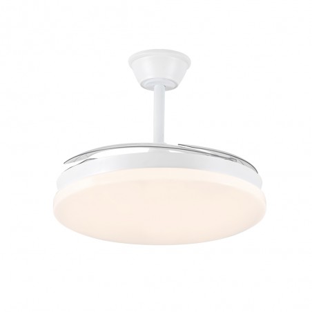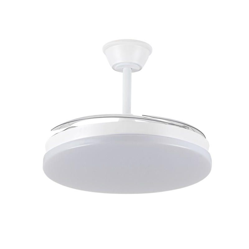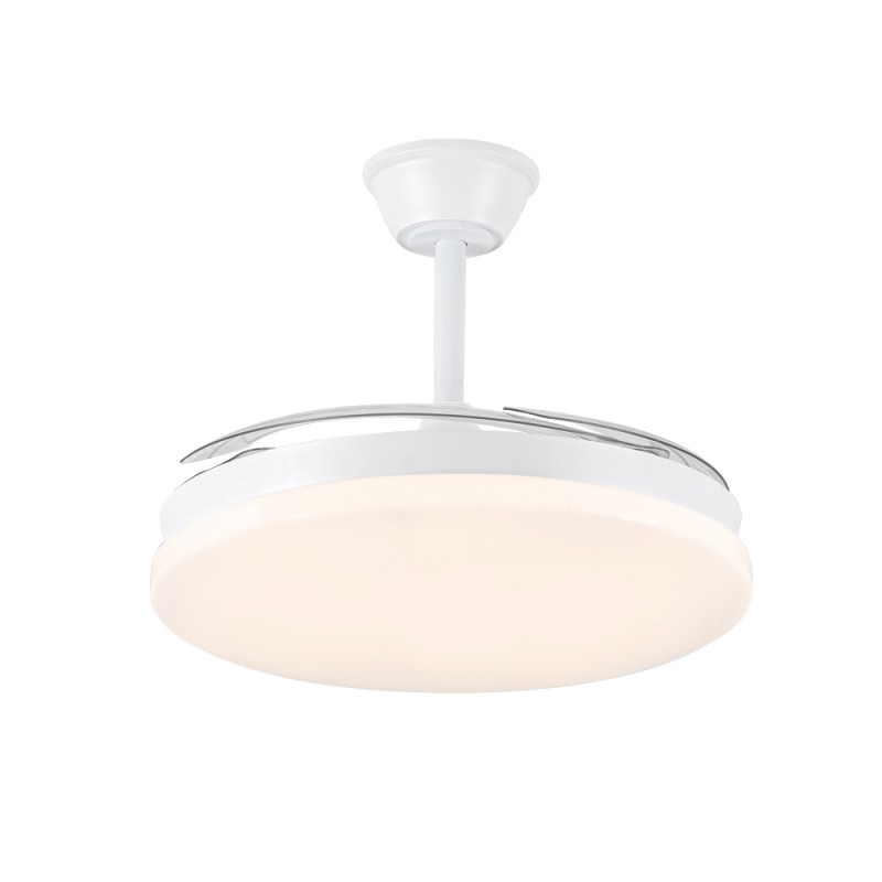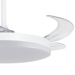 Milky L Evo retractable blades fan with Smart technology. Silent ceiling fan with retractable blades designed for medium-sized rooms. Diffuser of 48 centimetres, with a total diameter of 120 cm with the blades deployed in operation. You can control the speed and lighting with the remote control or with your smartphone via app. Reverse function, timer, breeze mode and power-on memory.