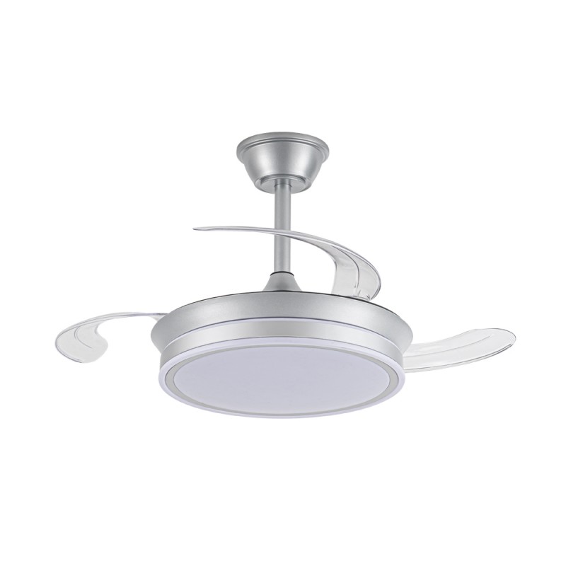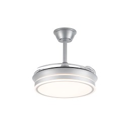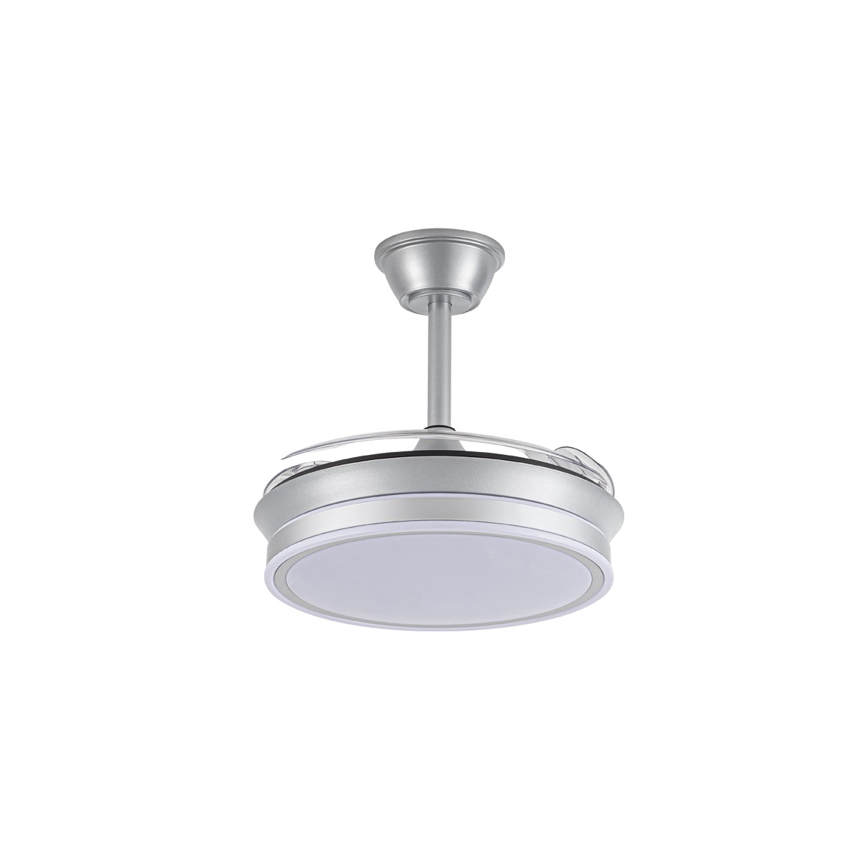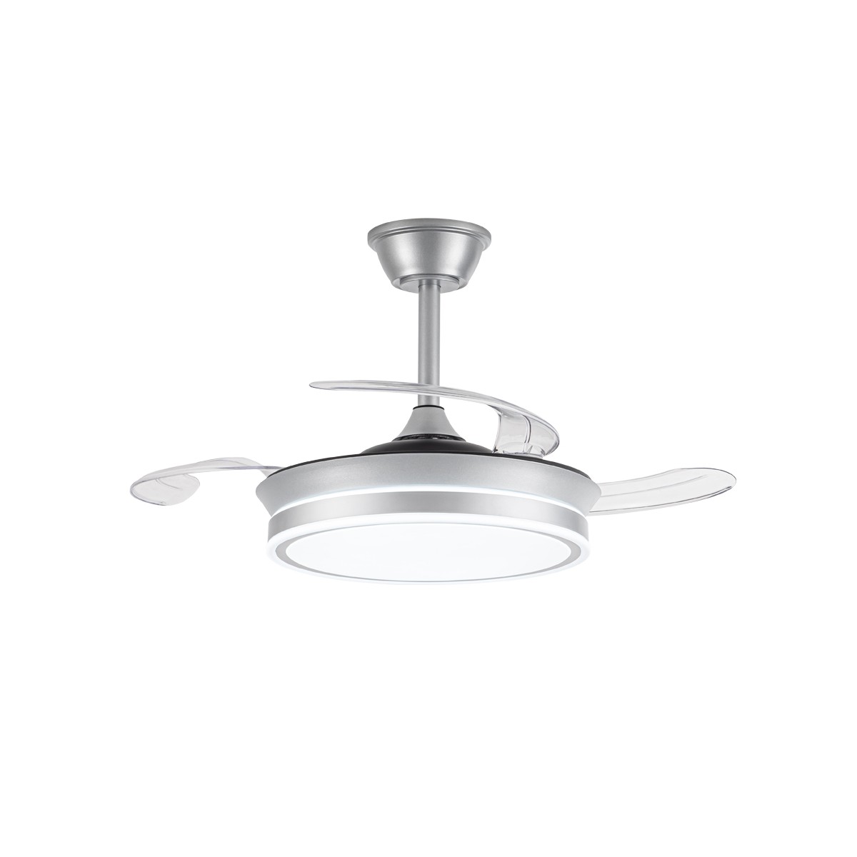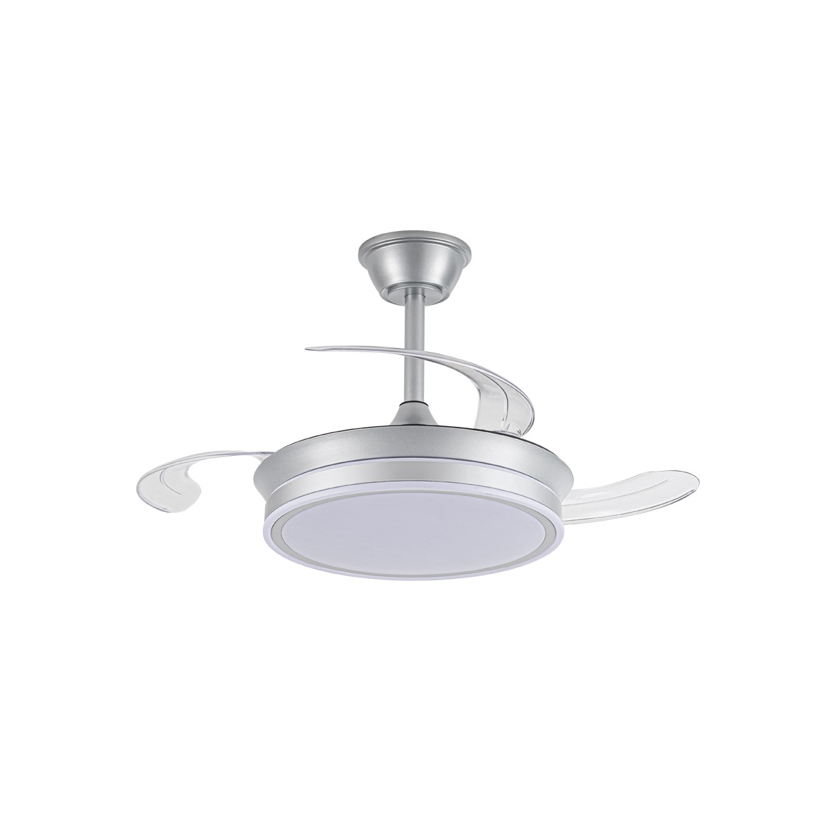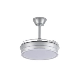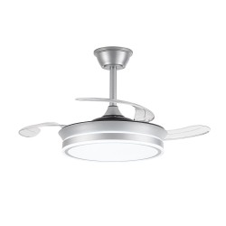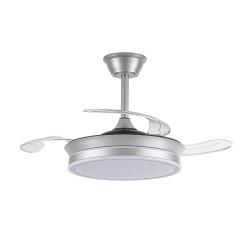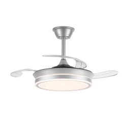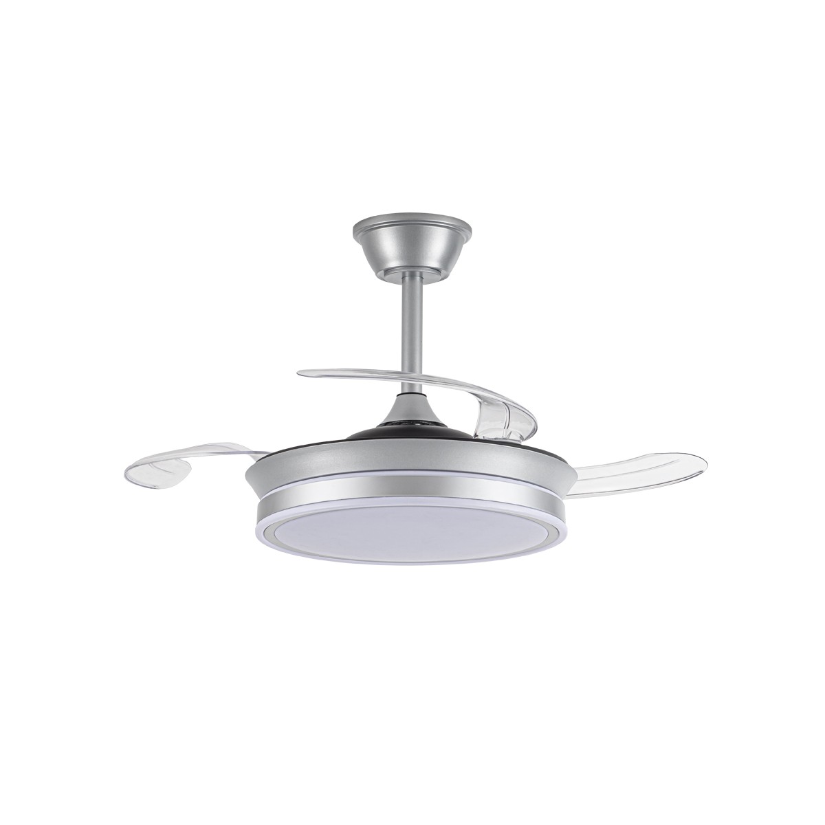 Silent fan with folding blades Evo. Silver fan with retractable blades specially designed for bedrooms and living rooms. Its six-speed DC motor emits minimal noise when the fan is in operation. It has energy-saving LED lighting and can be easily adjusted with the remote control. Reverse function winter-summer, timer and colour memory. Silent fan with retractable blades.