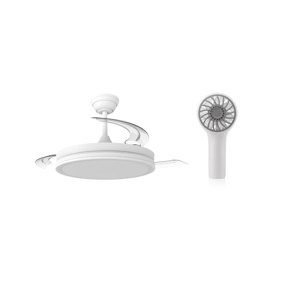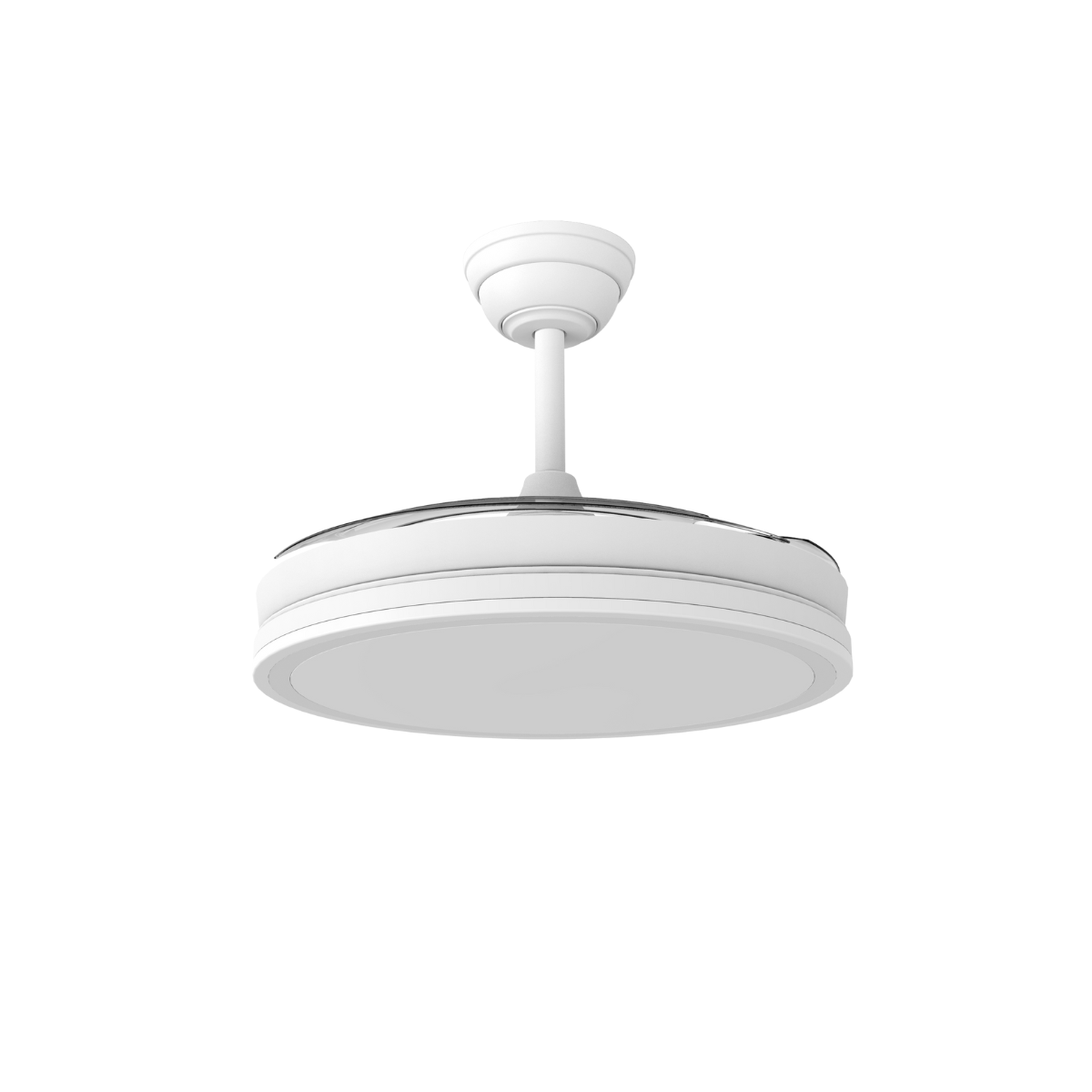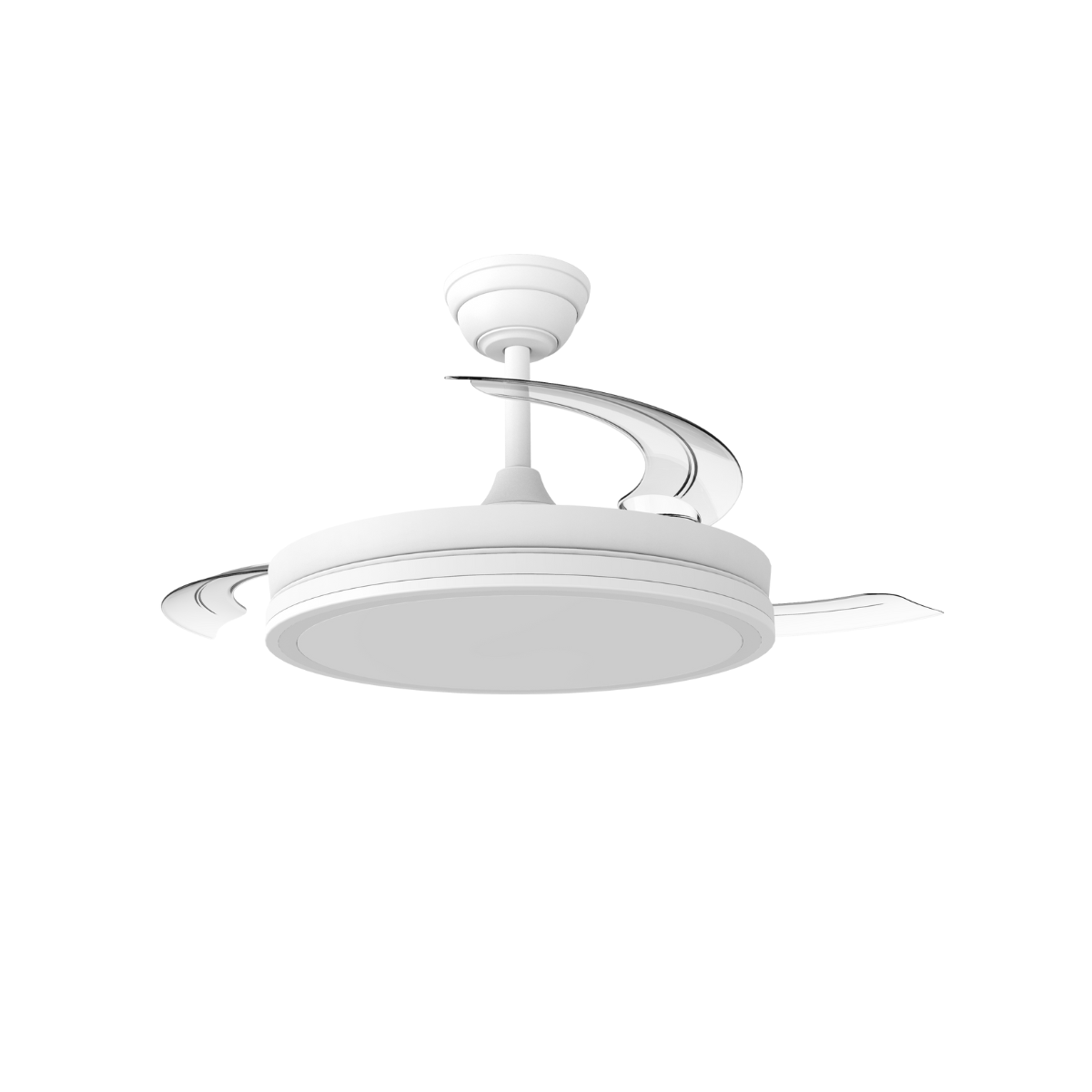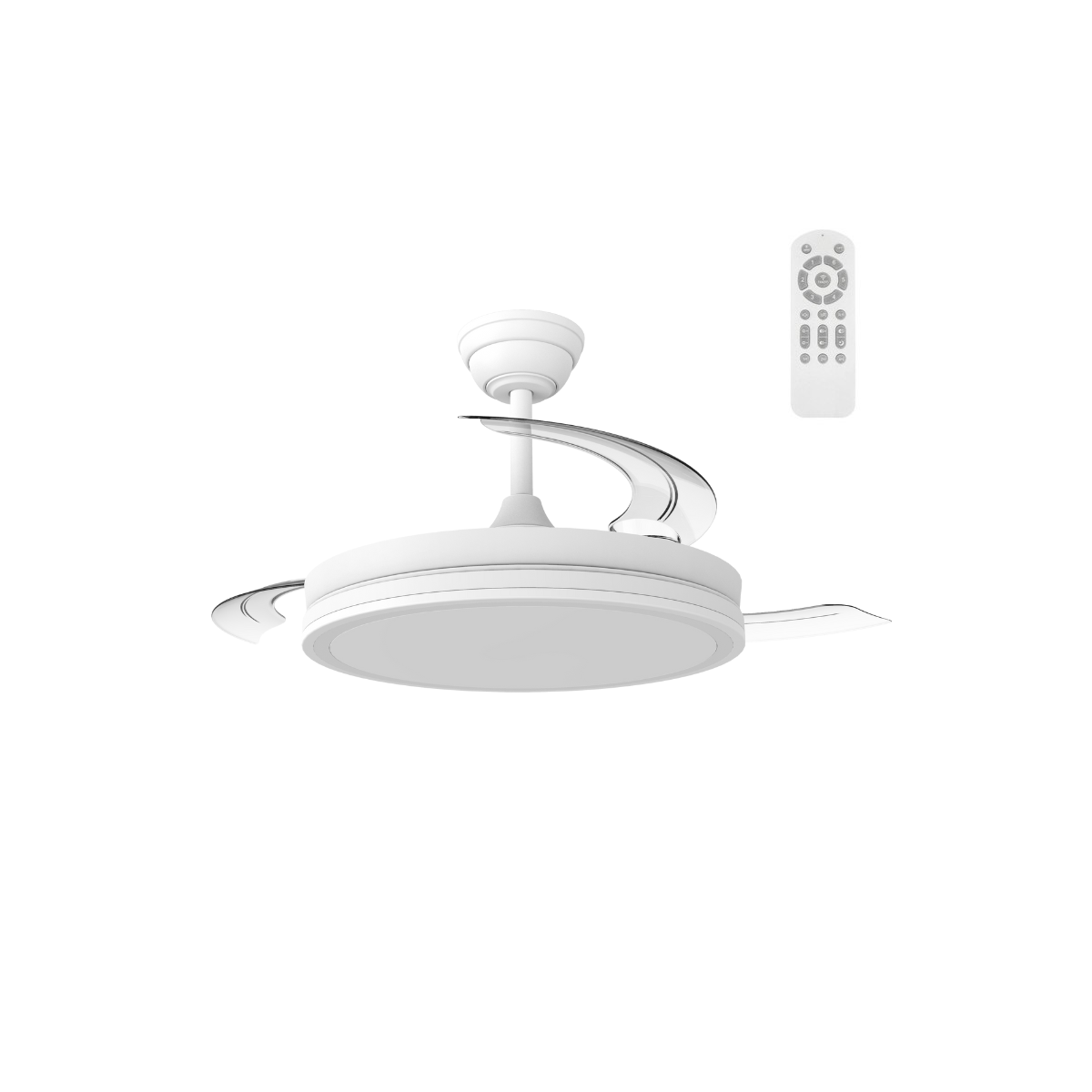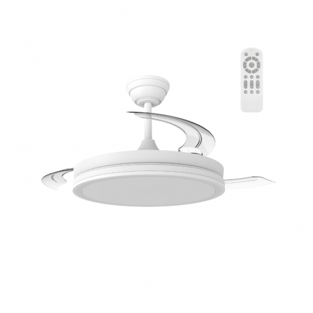 Silent fan for bedrooms. White fan with retractable blades specially designed for bedrooms and living rooms. Its six-speed DC motor emits minimal noise when the fan is in operation. It has energy-saving LED lighting and can be easily adjusted with the remote control. Reverse function winter-summer, timer and colour memory. Silent fan with retractable blades. ULTRA-QUIET NIGHT MODE