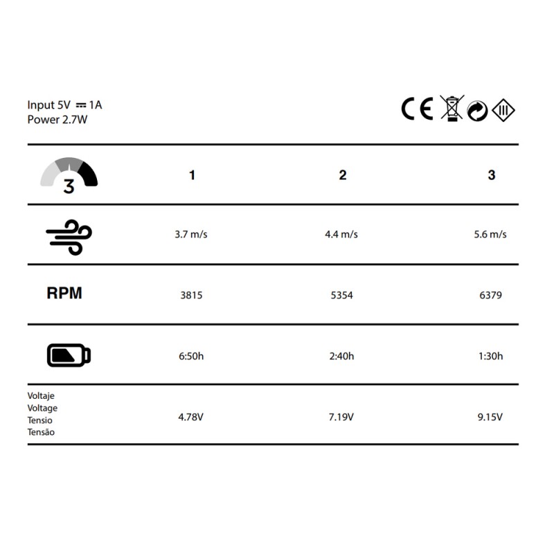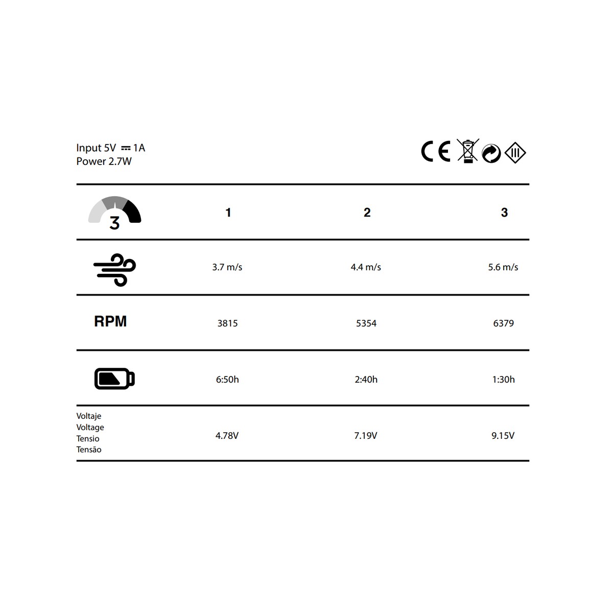 White Travel handheld fan. Practical portable fan with rechargeable battery for use at any time on hot days. It has three speeds, a rechargeable battery and a charge indicator.