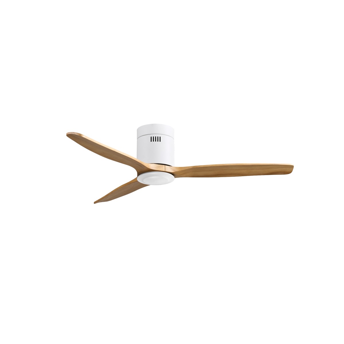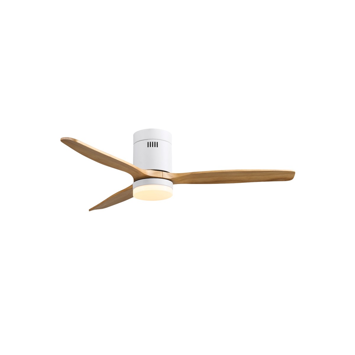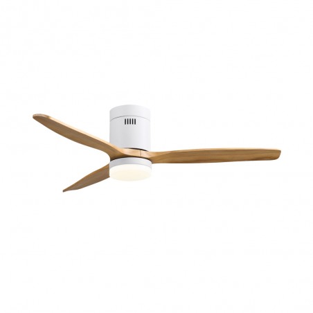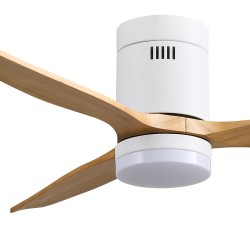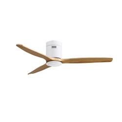 Ceiling fan Nine Eco White with LED light for rooms with low ceilings. Nordic-style design with white metal frame and three natural wood blades. Use the remote control to adjust the speed and lighting. Quiet DC motor with six speed settings and winter-summer reverse function.