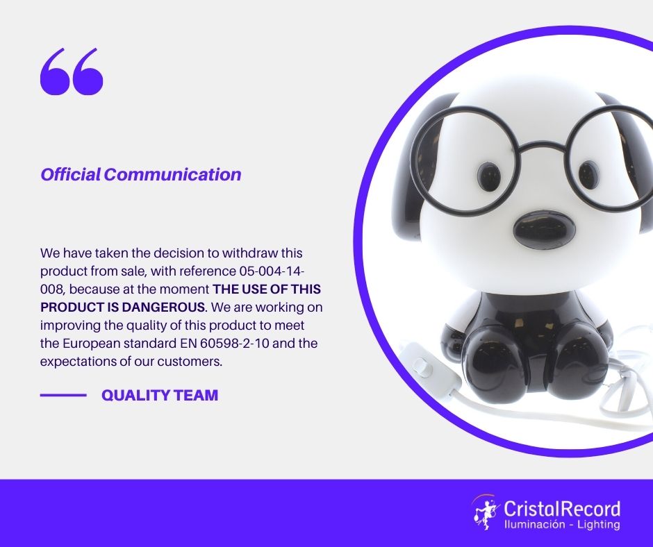 CristalRecord is always looking to improve its products in order to have the highest customer satisfaction. UNFORTUNATELY WE HAVE DETECTED THAT THE USE OF THE PRODUCT WITH THE REFERENCE 05-004-14-008, WHICH IS A TABLE LAMP FOR CHILDREN IS DANGEROUS AND DOES NOT COMPLY WITH THE EUROPEAN STANDARD EN 60598-2-10. We consider that this product is currently unsuitable for sale. We have taken the decision to withdraw this product from sale, until we improve the quality of this product so that it meets European standards and the expectations of our customers. We are working on it, and we ask our customers if you have any stock of this reference, to inform us as soon as possible so we can proceed to its withdrawal, assuming CristalRecord, S.L.U. the costs of it. Thank you very much for your cooperation.