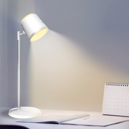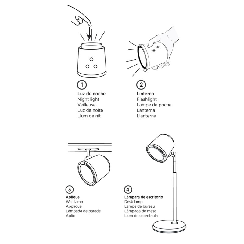 Desk lamp with rechargeable battery. Practical 4-in-1 LED lamp for use in any room in the house. You can use it as a desk lamp, as a night light, as a portable torch or even as a wall light. It has integrated LED lighting adjustable in both lumen intensity and colour tone (3000-4000-6500K). Rechargeable battery.