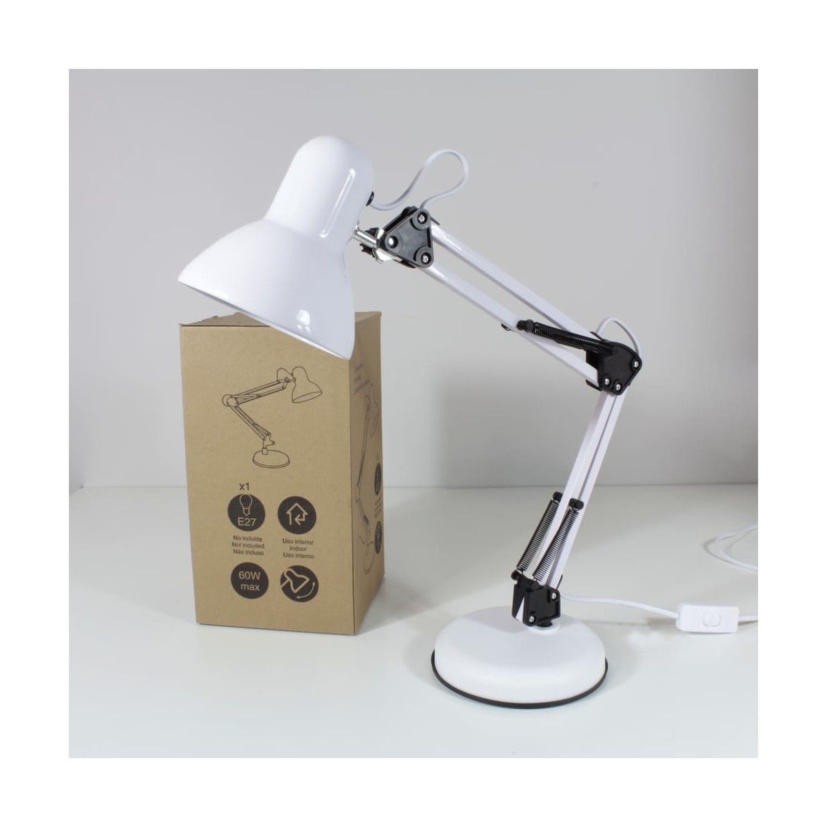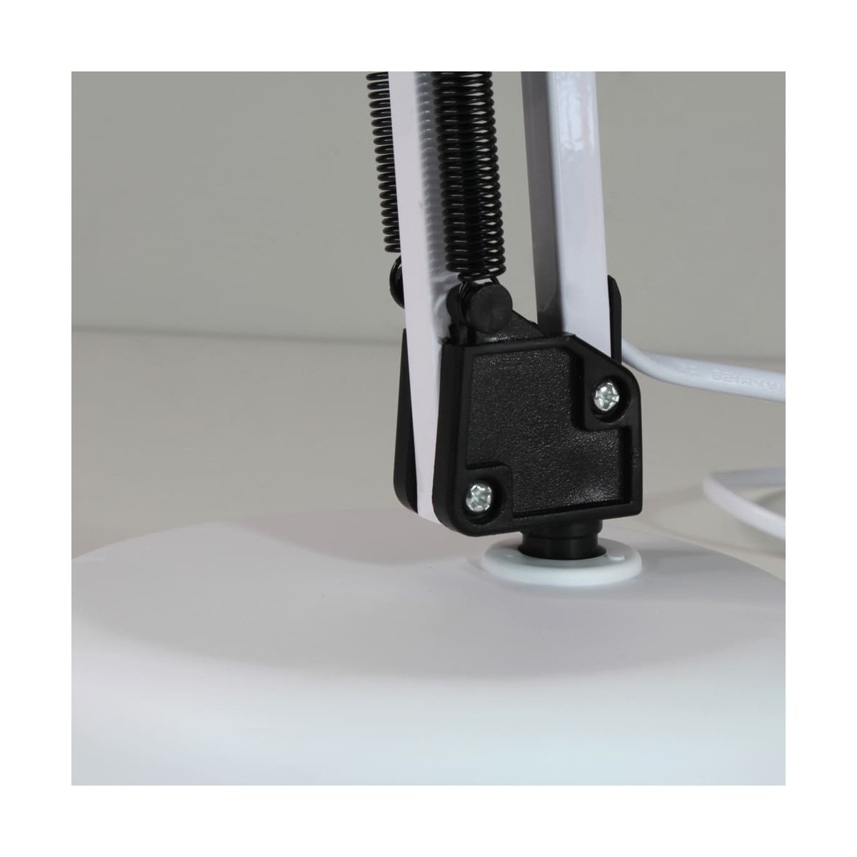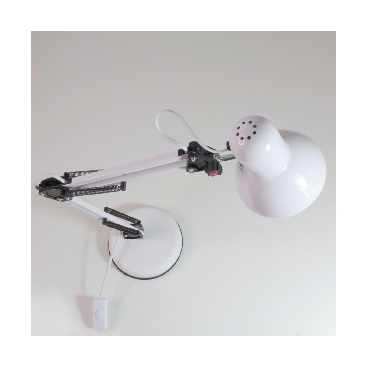 Articulated white lacquered metal desk lamp with round base. Suitable for E27 bulbs. The lamp has a 110cm cable and is articulated both the body and the head allowing to direct the light to the desired point.