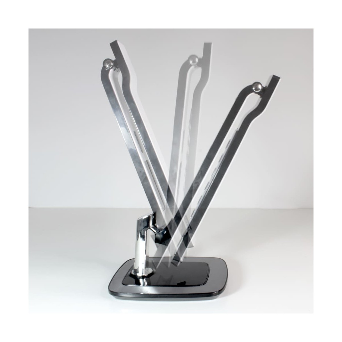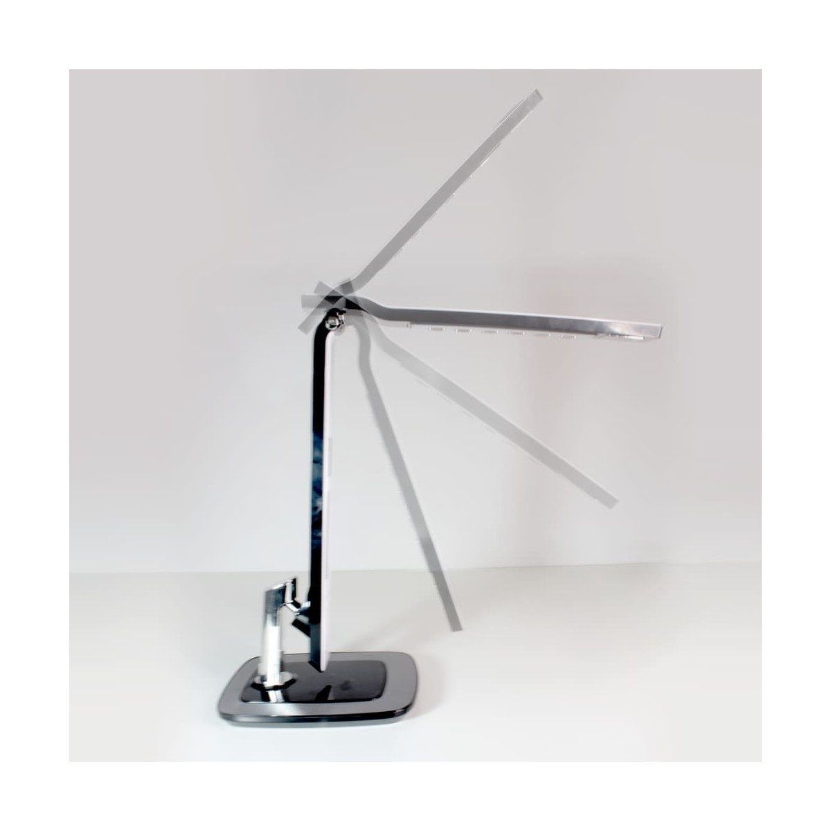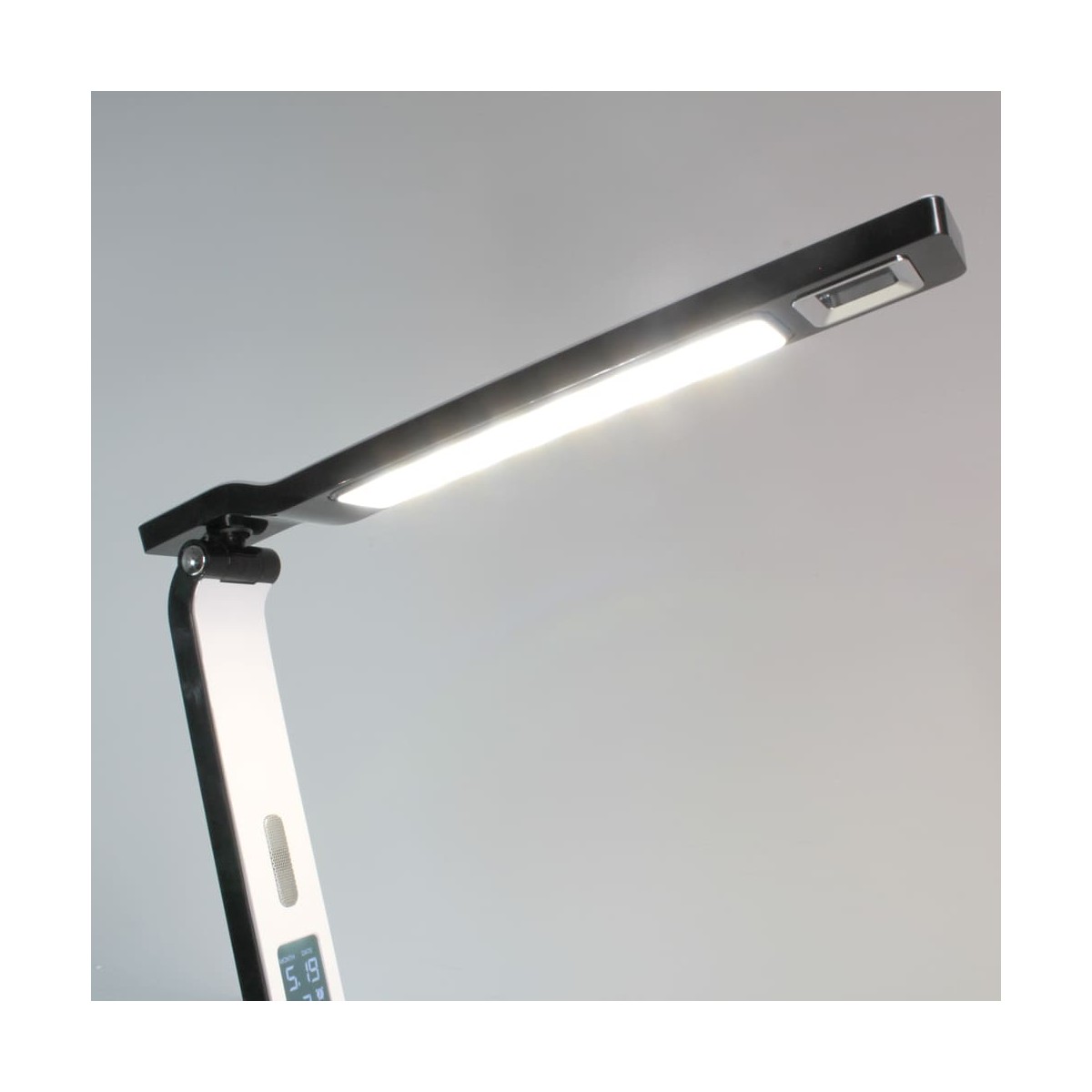 10W LED desk lamp with three light tonalities and 6 light intensities. It permits setting an alarm clock and a pre-alarm. Digital LCD display with date and time and USB port for charging electronic devices. The pre-alarm can be set 0-2-5-10-15 minutes before the alarm sounds, at which time the lights will gradually start to turn on accompanied by a bird sound. The desk lamp has an adjustable body and head. It is tactile, very easy to use with the buttons below the display.