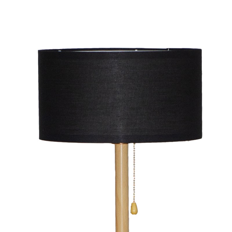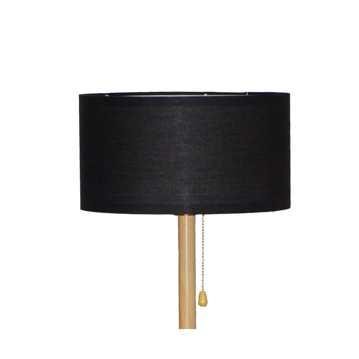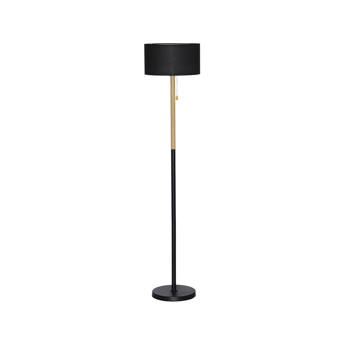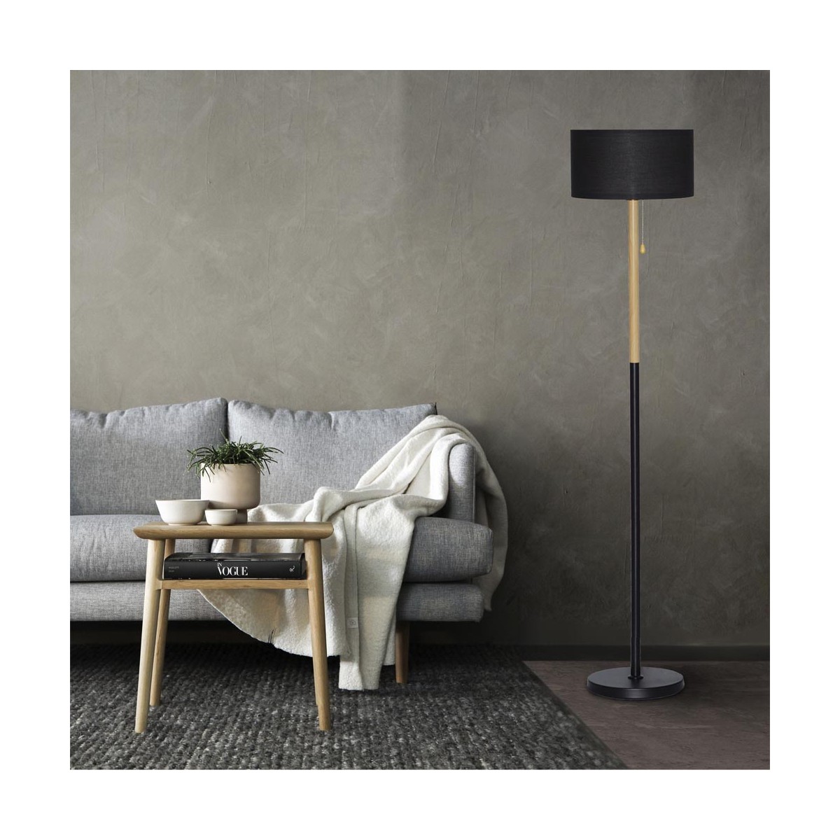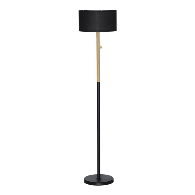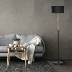 Nordic floor lamp Olivia. Nordic style floor lamp to be placed in the living room or dining room. Metal structure with wooden decoration and black fabric lampshade. Perfect to place next to a sofa area or in the corner of the room. It has a handle where the bulb is placed to turn on and off the light of the floor lamp.