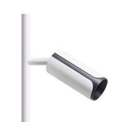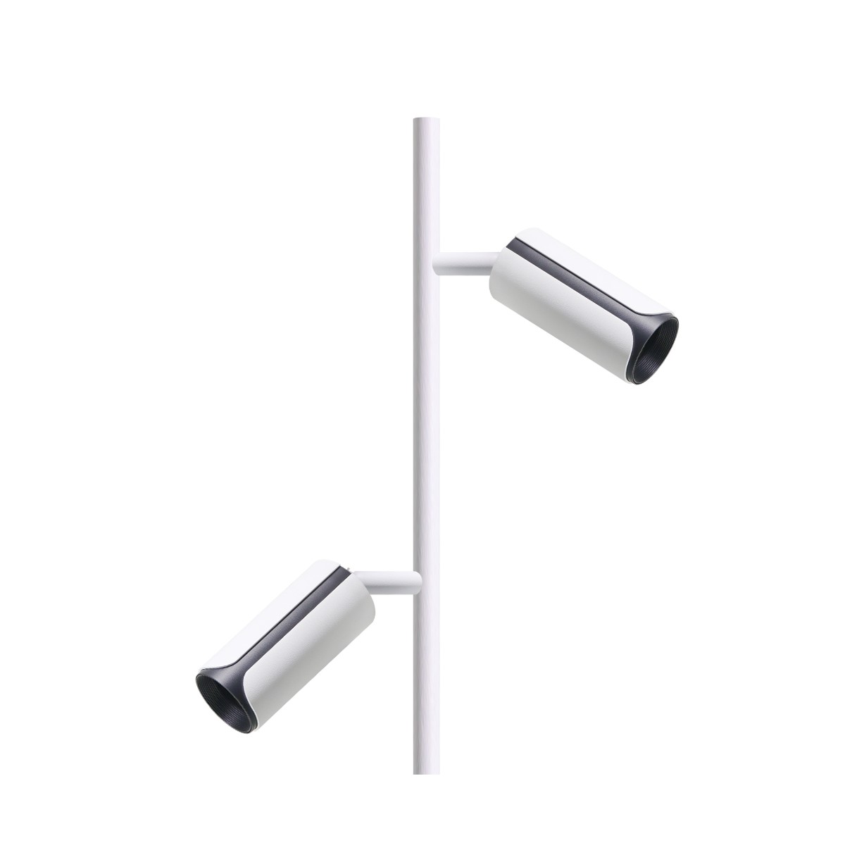 Gobi floor lamp with two lights. Modern floor lamp with two individually adjustable spotlights. To be placed next to a sofa area or armchair as auxiliary lighting or reading light. Made of sandblasted white aluminium, with the inside of the spotlights in black. Gobi Collection.