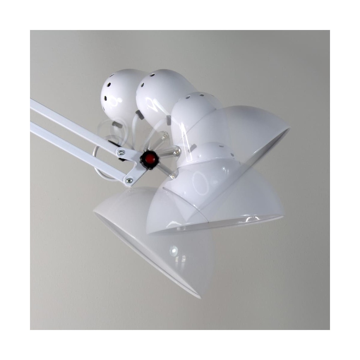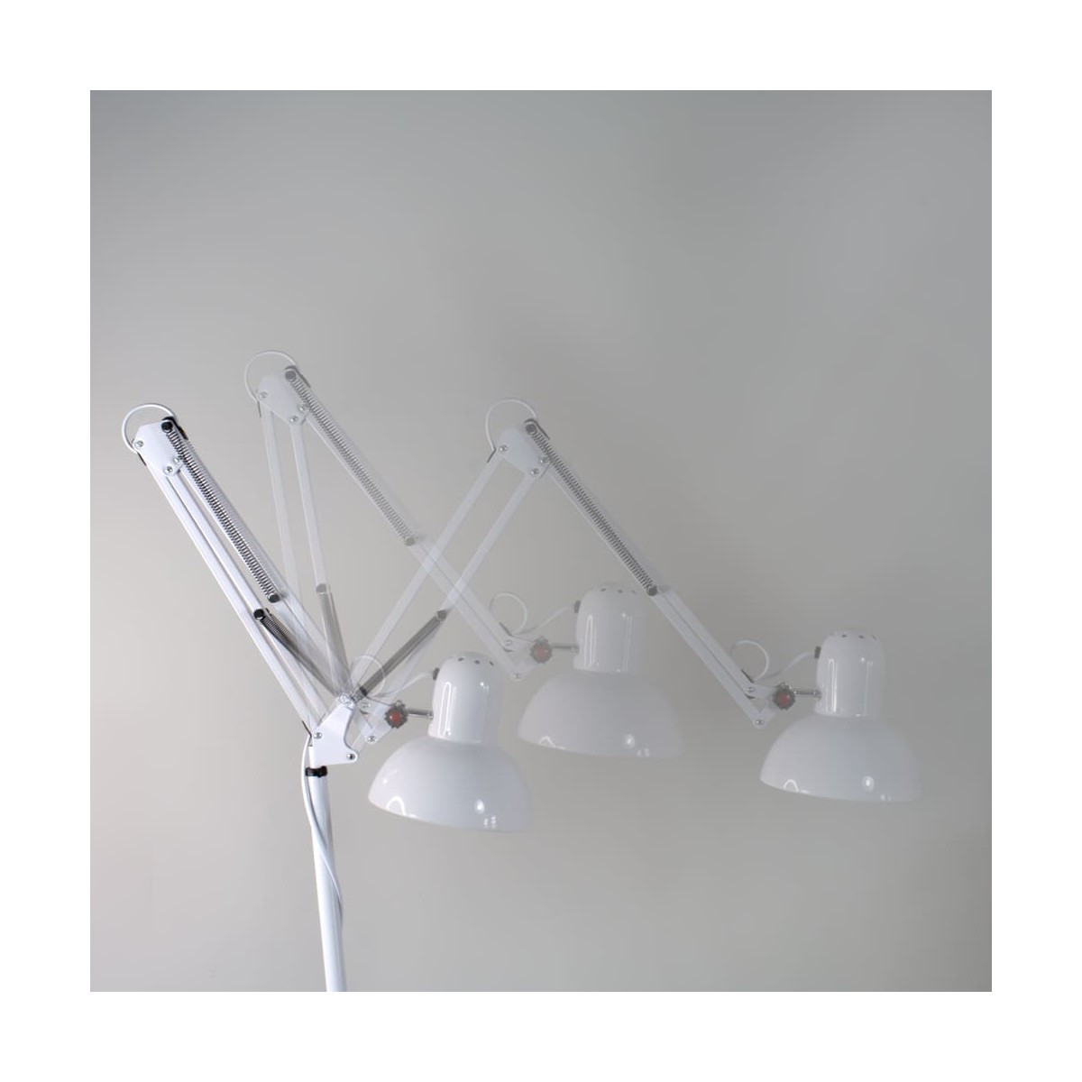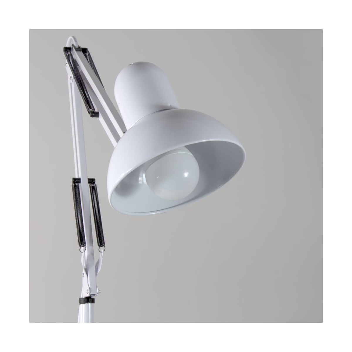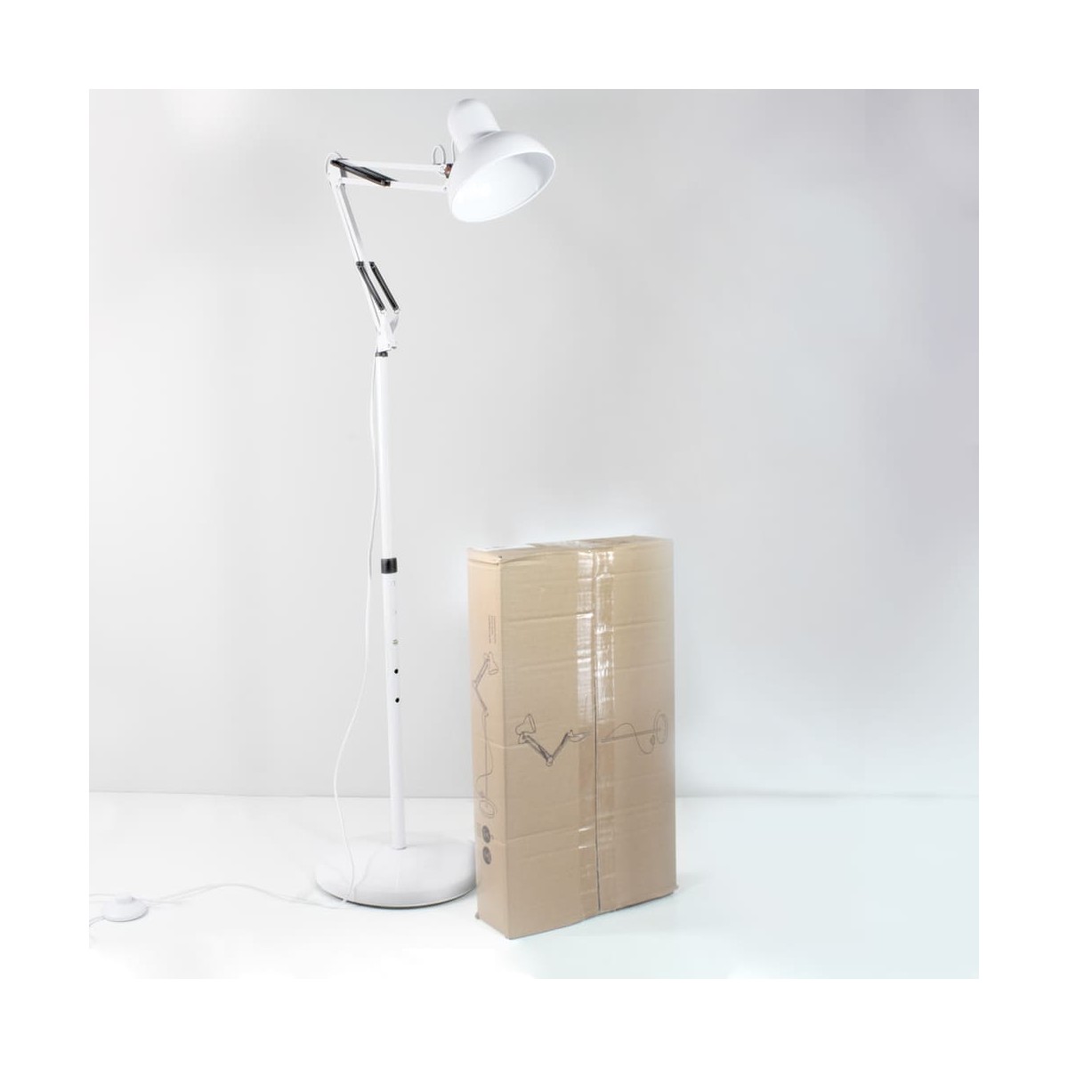 Classic style articulated floor lamp in white lacquered metal with round base and height adjustable body. Suitable for E27 bulbs. This floor lamp has a 240cm cable and a switch on the floor that allows you to turn on the lamp with your foot without bending down. Both the body and the head are articulated, allowing the light to be directed to the desired point, and the stand is adjustable in height between 45 and 90cm.