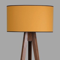 Floor lamp with three wooden legs and a side table with a height of 153cm and a total base of 50cm. The fabric lampshade, available in various colours, has a diameter of 45cm and a height of 24cm. The 26cm round side table is at a height of 65cm from the floor. It is powered by an E27 bulb not included. The on/off button of the lamp is located on the cable.