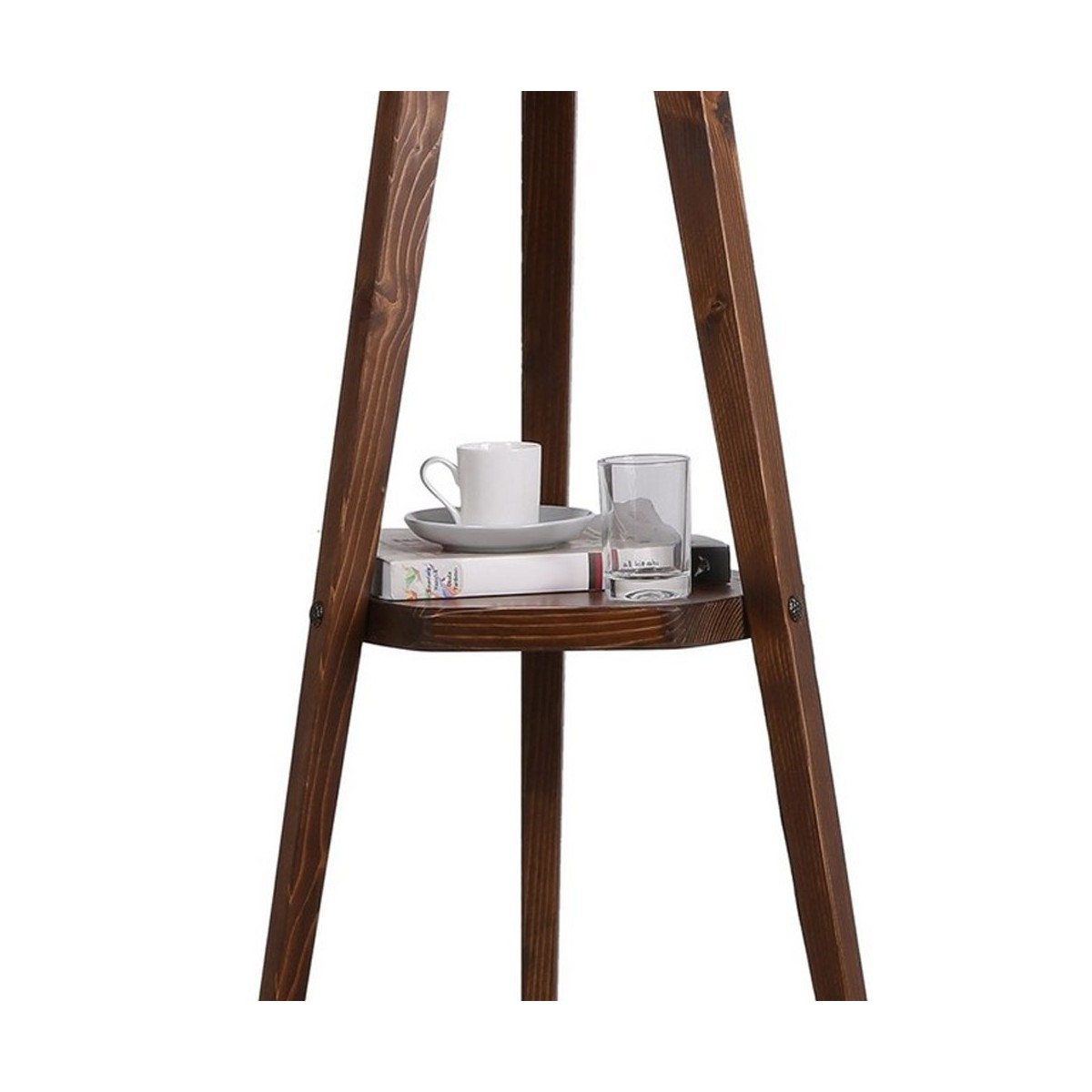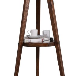 Floor lamp with three wooden legs and a side table with a height of 153cm and a total base of 50cm. The fabric lampshade, available in various colours, has a diameter of 45cm and a height of 24cm. The 26cm round side table is at a height of 65cm from the floor. It is powered by an E27 bulb not included. The on/off button of the lamp is located on the cable.
