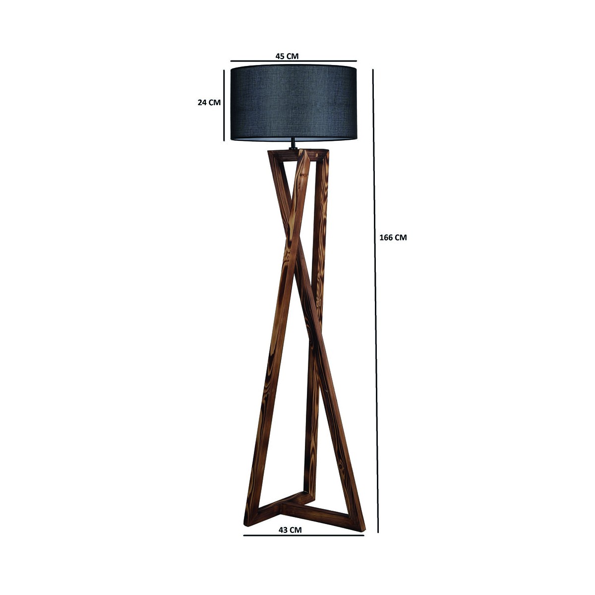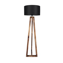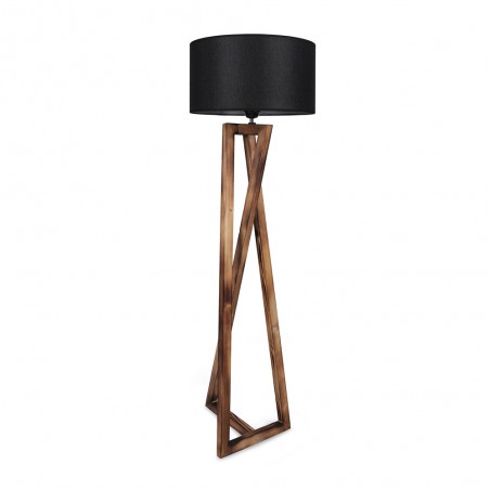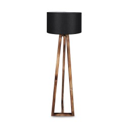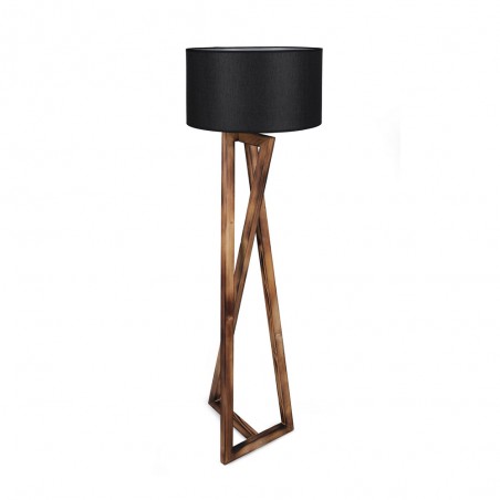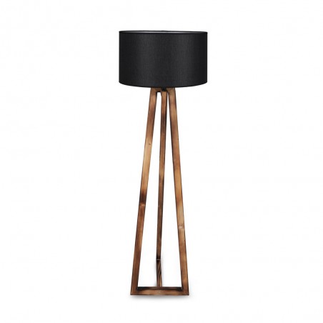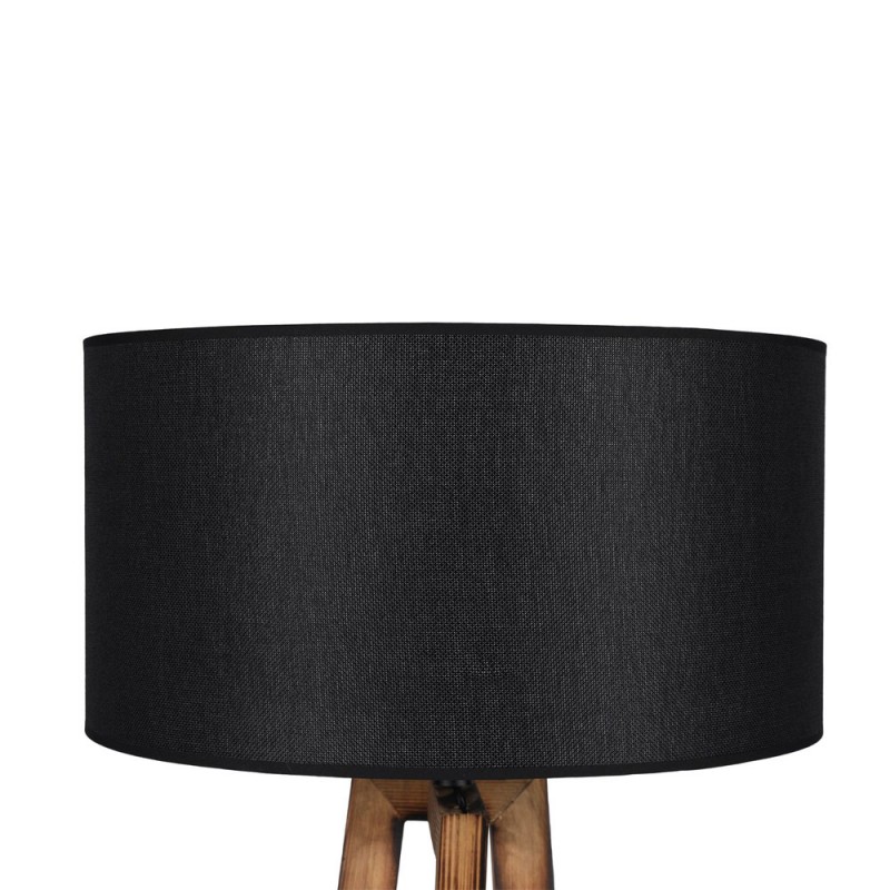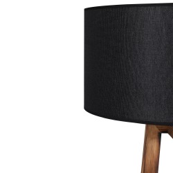 Floor lamp with three wooden legs with a geometric design, 166cm high and a base of 43cm. The fabric lampshade, available in light grey and anthracite grey, has a diameter of 45cm and a height of 24cm. It is powered by an E27 bulb not included. The on/off button for the lamp is located on the cable.