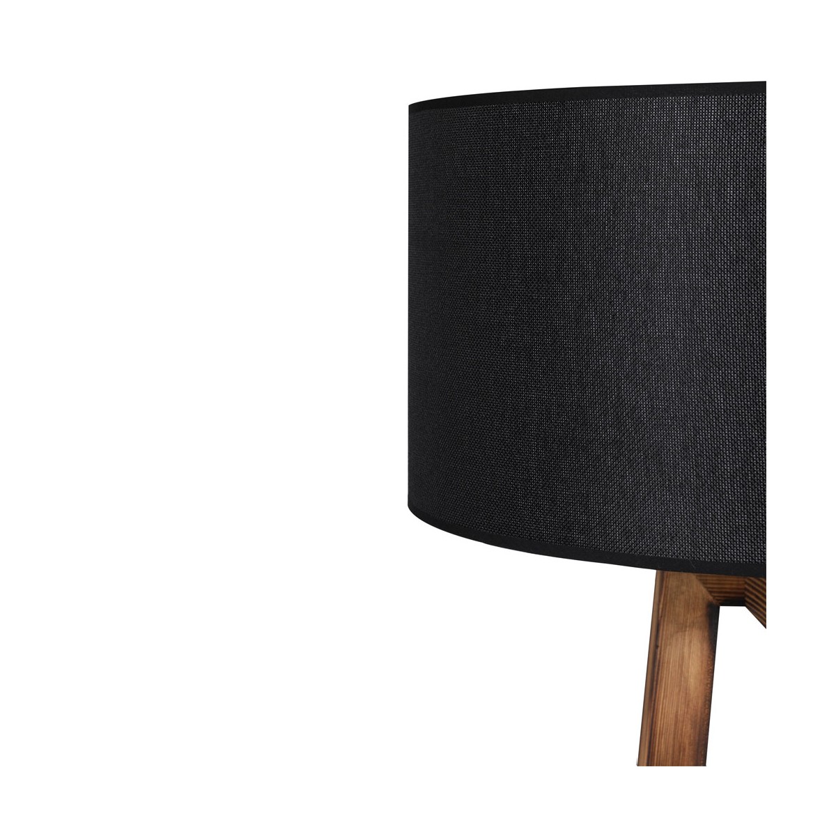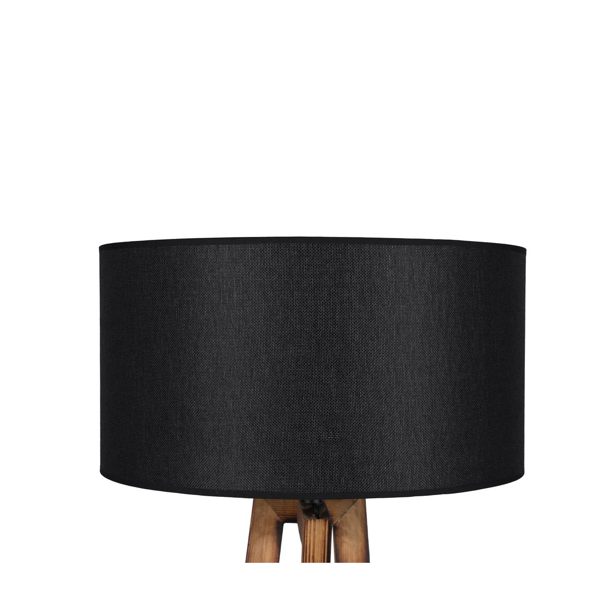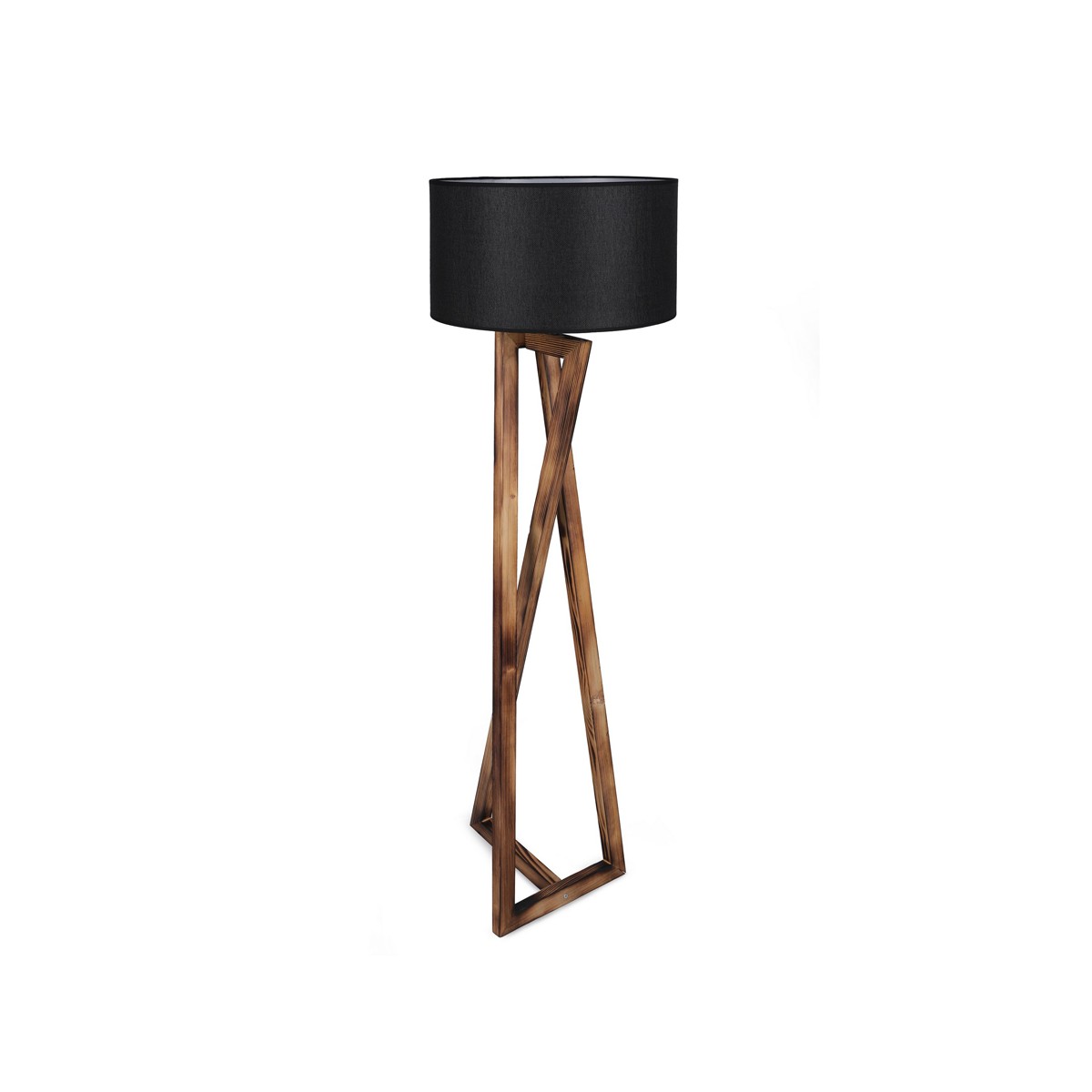 Floor lamp with three wooden legs with a geometric design, 166cm high and a base of 43cm. The fabric lampshade, available in light grey and anthracite grey, has a diameter of 45cm and a height of 24cm. It is powered by an E27 bulb not included. The on/off button for the lamp is located on the cable.
