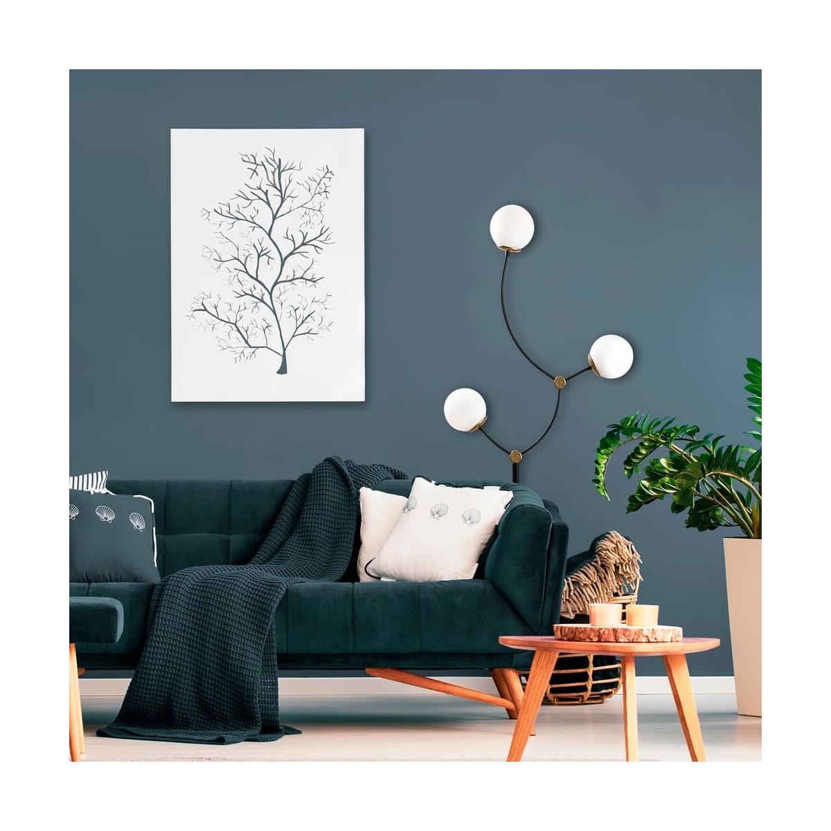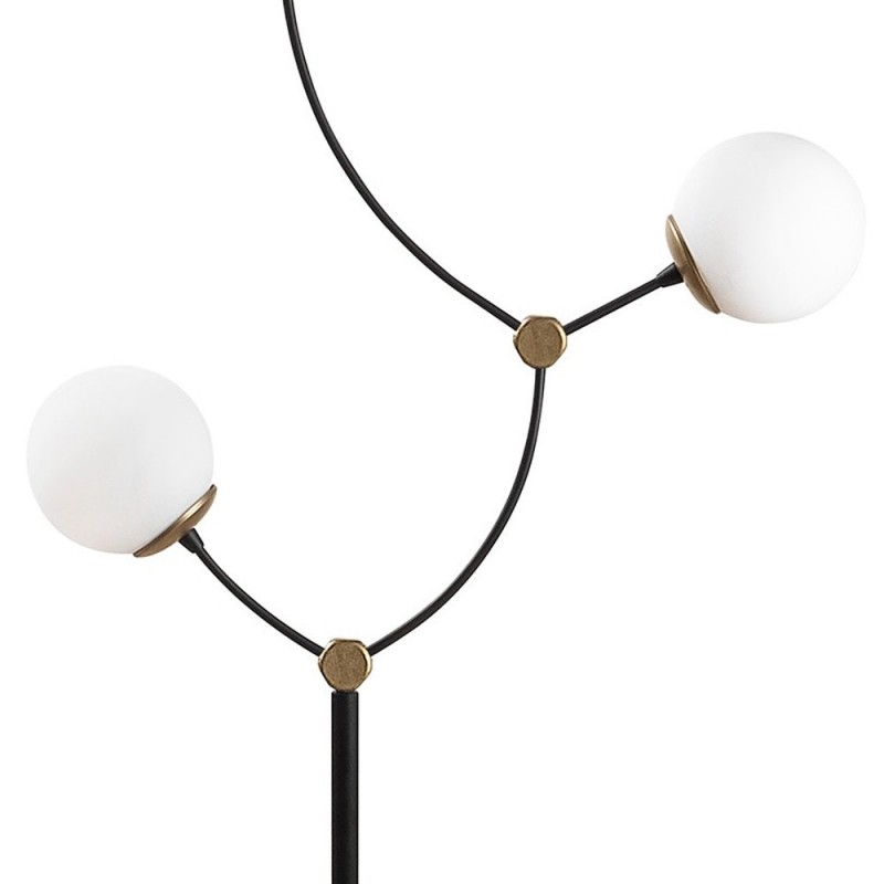 Decorative floor lamp with a black lacquered metal body, 151 cm high and three lights with a matt white glass shade. The lamp base has a diameter of 65cm with a cable length of 350cm. It works with E27 bulbs, not included.