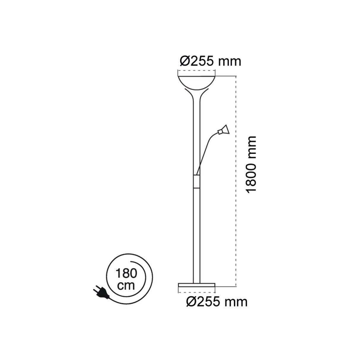 Classic floor lamp in aluminium with nickel finish. It has two lights, the main light works with two E27 bulbs, while the reader light has an E14 bulb wire with a frosted white glass shade. The arm of the reader can be swivelled. The cable measures 180 cm.