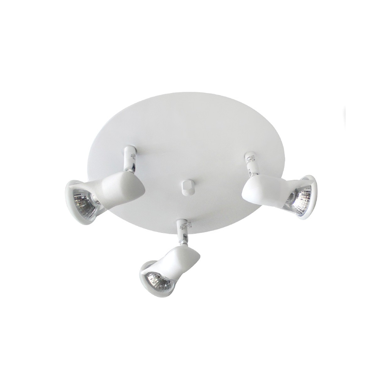 Ceiling lamp in white finish with round base and 3 spots. G10 bulbs not included. Compatible with one LED bulb.