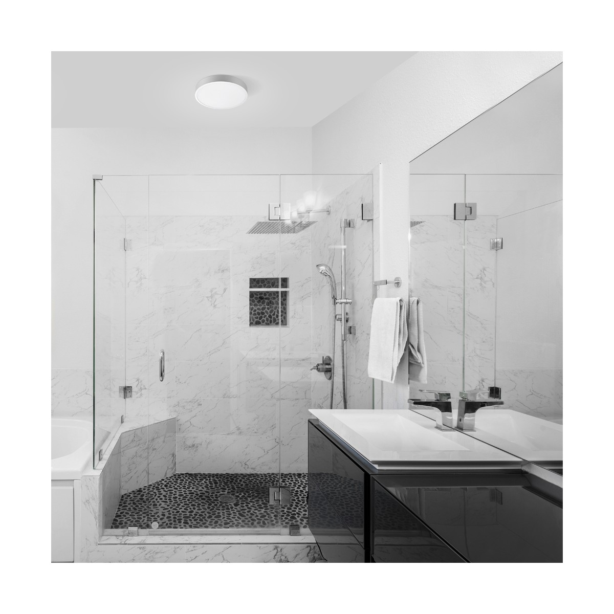 Surface mounted LED Downlight made of aluminium in a chrome finish and round shape. Contemporary bathroom lighting IP44 rated, able to be fitted over a shower cubicle.