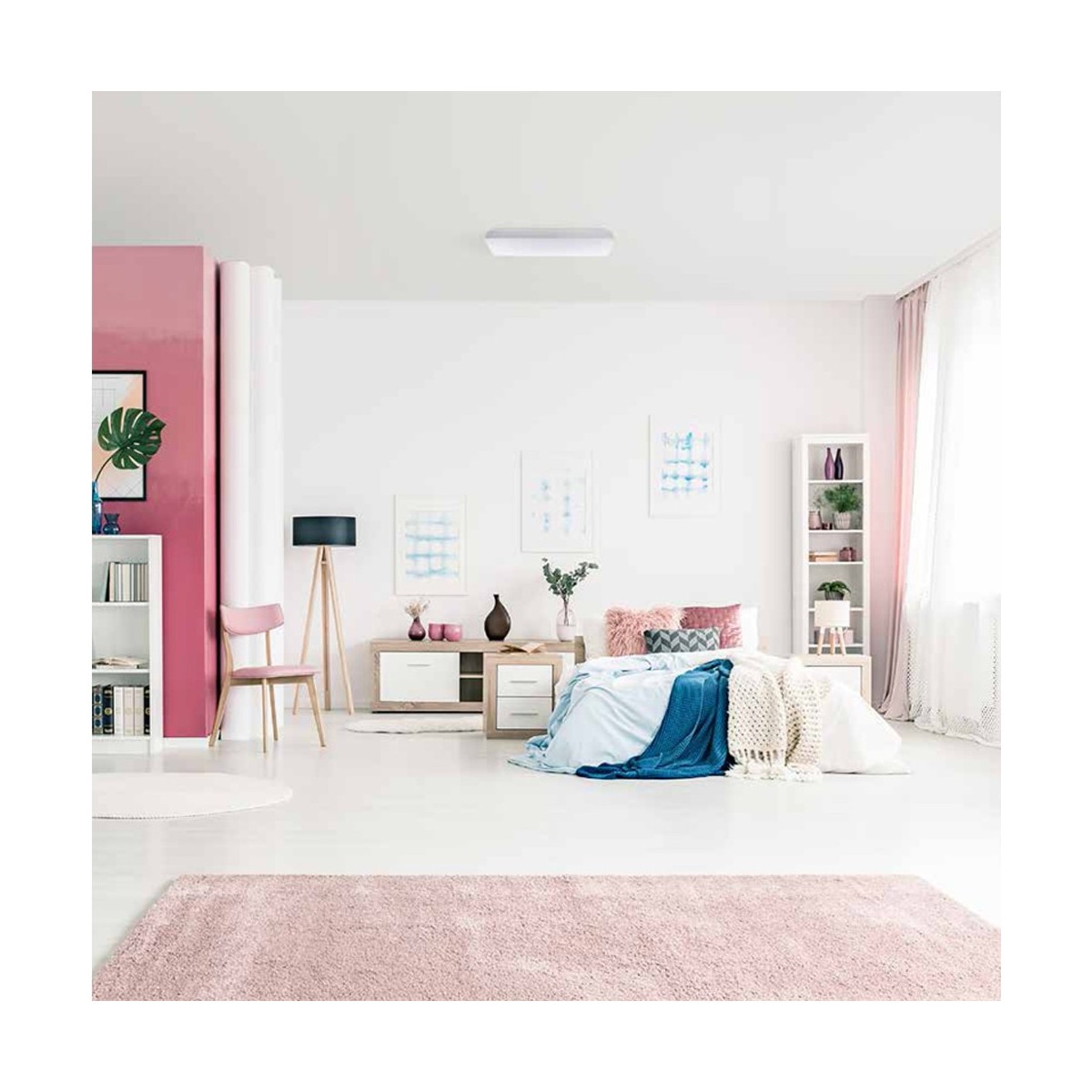 42 watts LED Ceiling Light that offers three different colour temperatures and dimmable intensity. Remote control included. The frame is made of aluminium and it has a white plastic finish. It also includes a night light mode making it ideal for children's rooms.