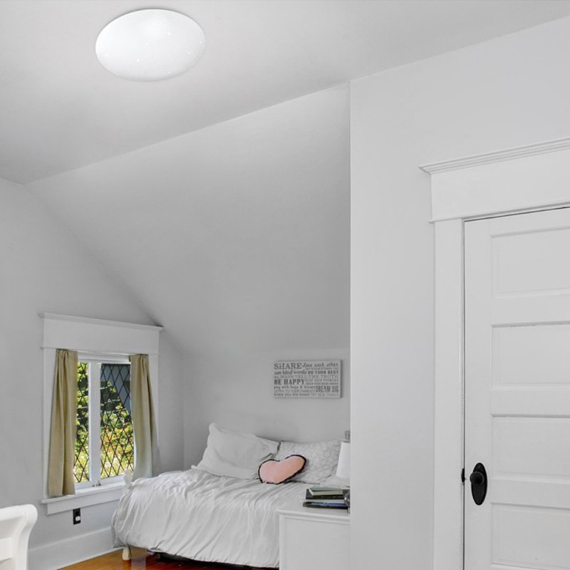 100 watts LED Ceiling Light that offers three different colour temperatures and dimmable intensity. Remote control included. The frame is made of aluminium and it has a white plastic finish. It also includes a night light mode making it ideal for children's rooms.