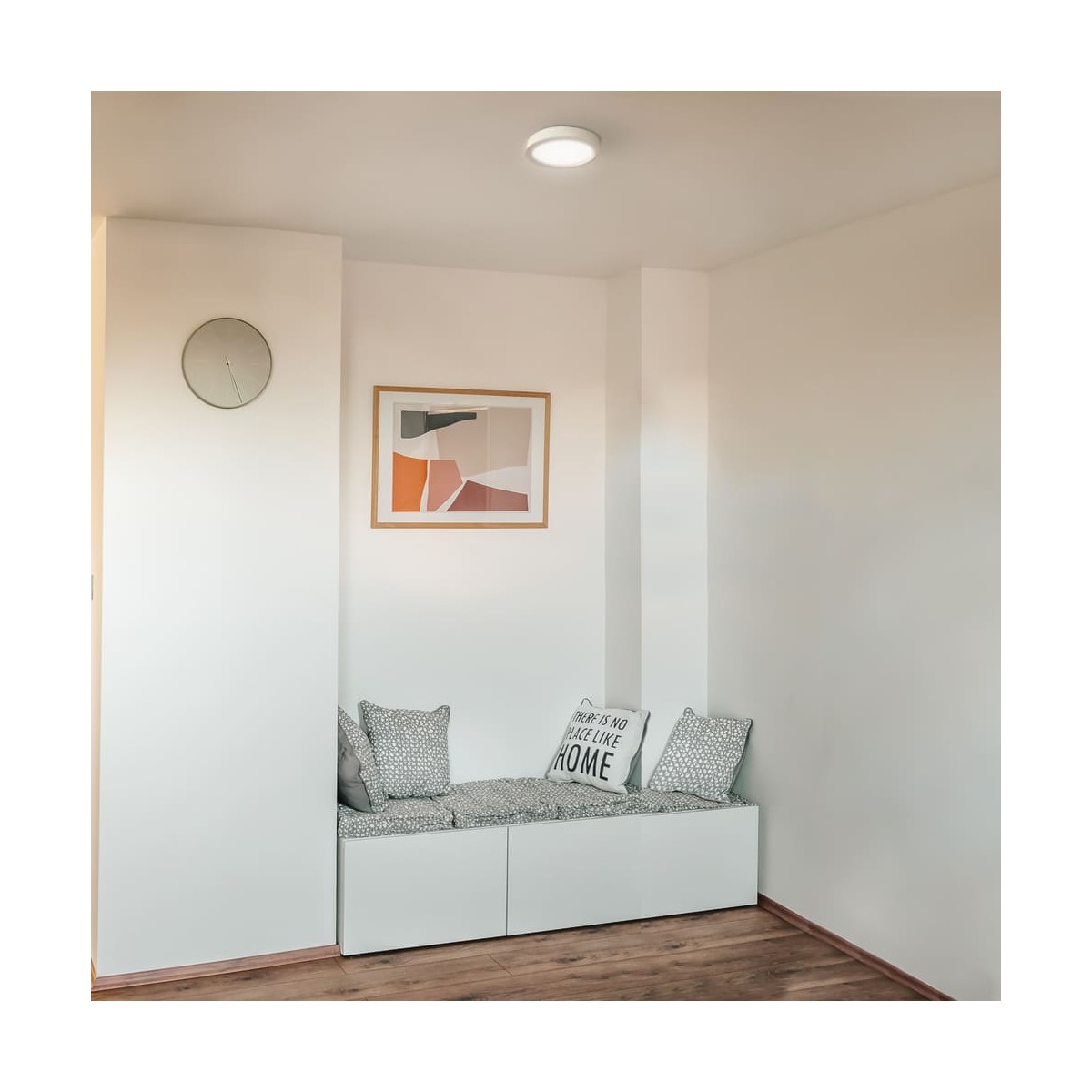 Round surface downlight with integrated 12W LED lighting, with 960 lumens. Neutral light 4000K. White lacquered aluminium structure with acrylic diffuser.