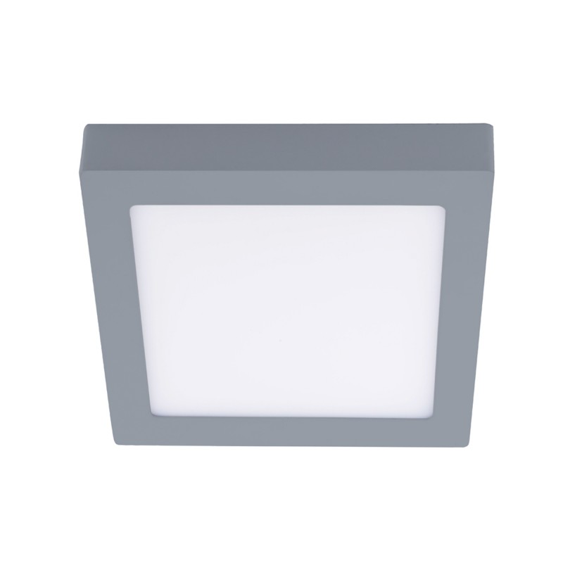 Square surface downlight with integrated 18W LED lighting, with 1440 lumens. Neutral light 4000K. Grey lacquered aluminium structure with acrylic diffuser.