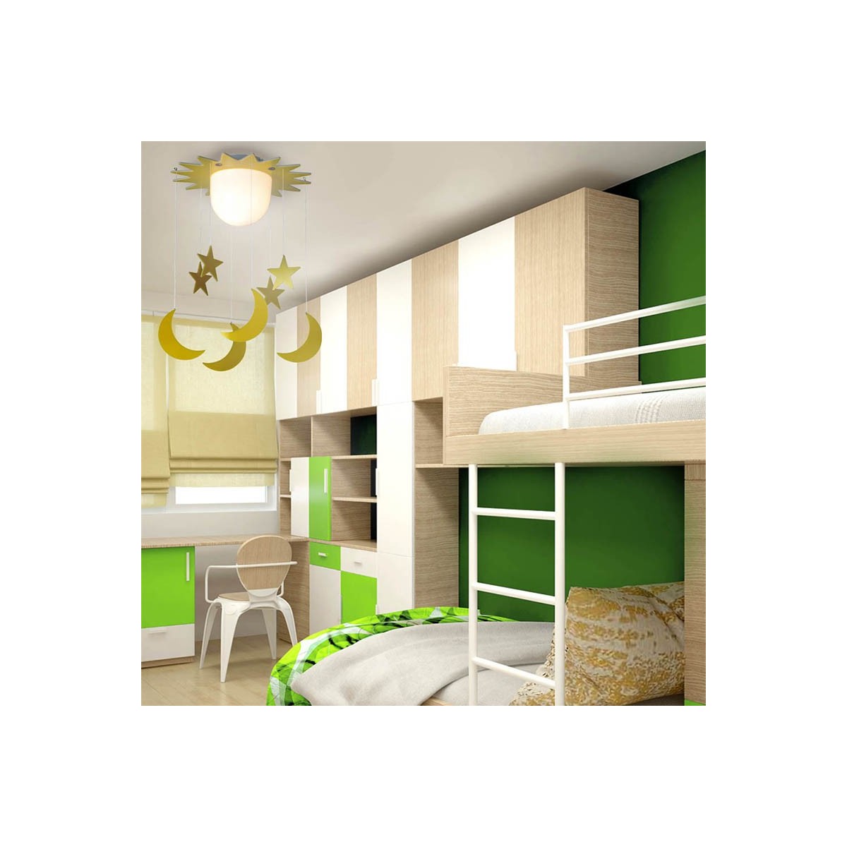 Fugaz Ceiling Light for children's room. It has a glass lampshade and pendants of moons and stars in yellow plastic. Great decoration with symbolic sun shape celling light, in yellow colour, with high luminosity by placing a LED Light Bulb of E27 thread, not included.