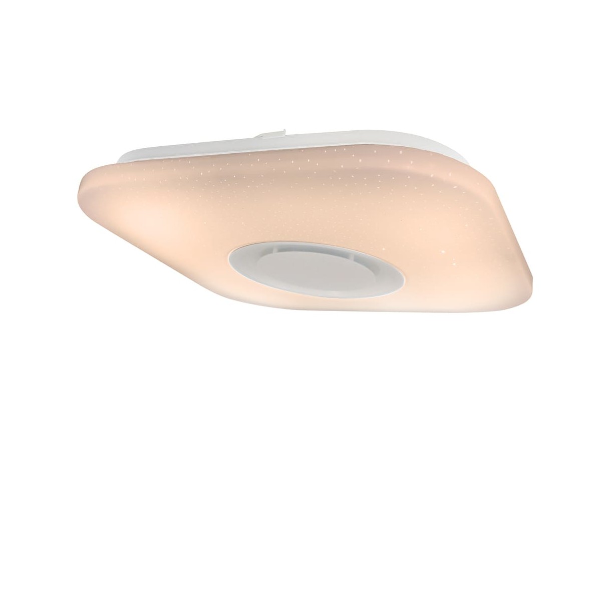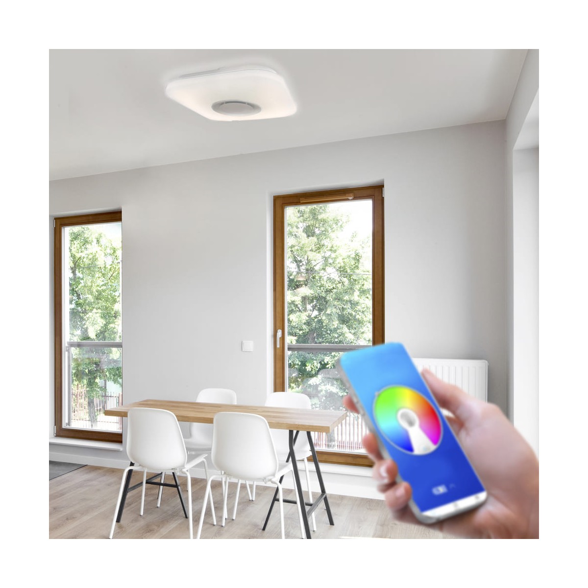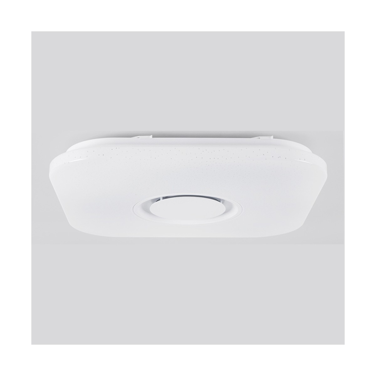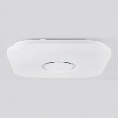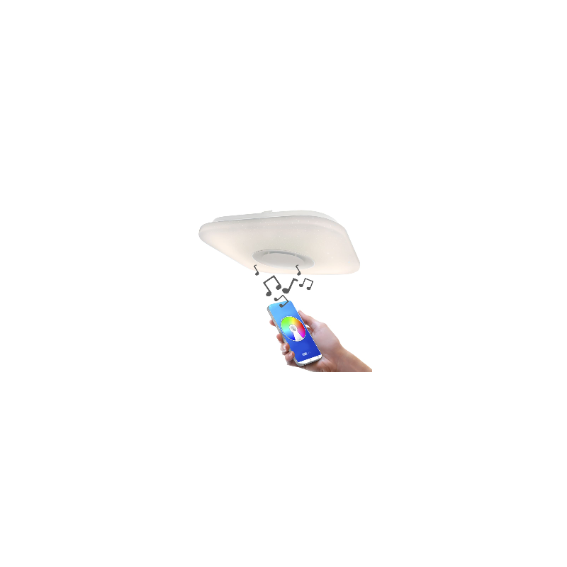 Square ceiling light with RGB LED lighting and speaker. Very practical ceiling light for lighting bedrooms and living rooms. Adjustable light intensity and color temperature (3000-6500K) with a wide RGB color gamut. It is controlled by a remote control which can also be used with a smartphone via an app. It has a built-in speaker to play music. Diffuser in white PVC.