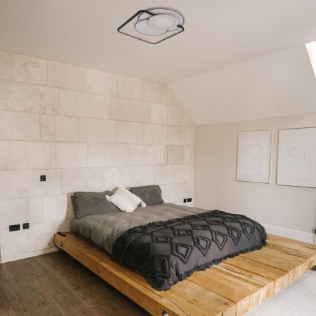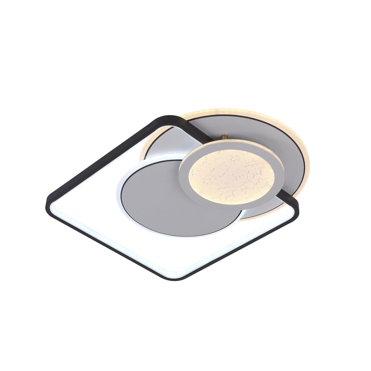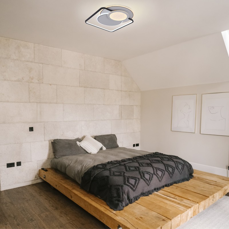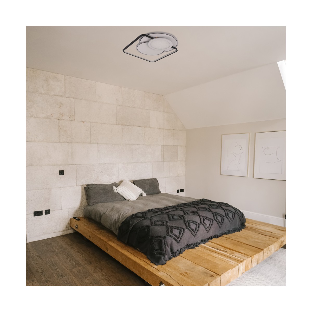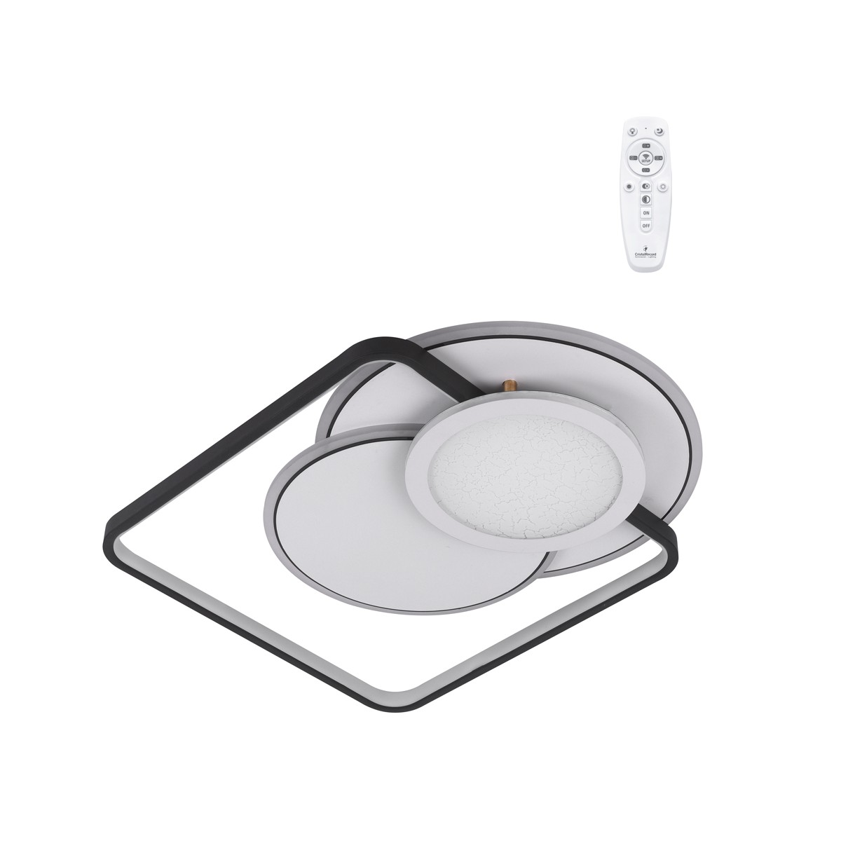 Cora LED ceiling flush light for modern living rooms. Ceiling lamp with three colour temperatures, ideal for use as main lighting in a living room. Modern design with circular shapes and a square frame. Remote control to set different colour tones. You can also control the ceiling light with your smartphone via an app.