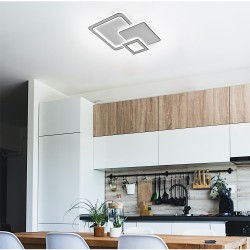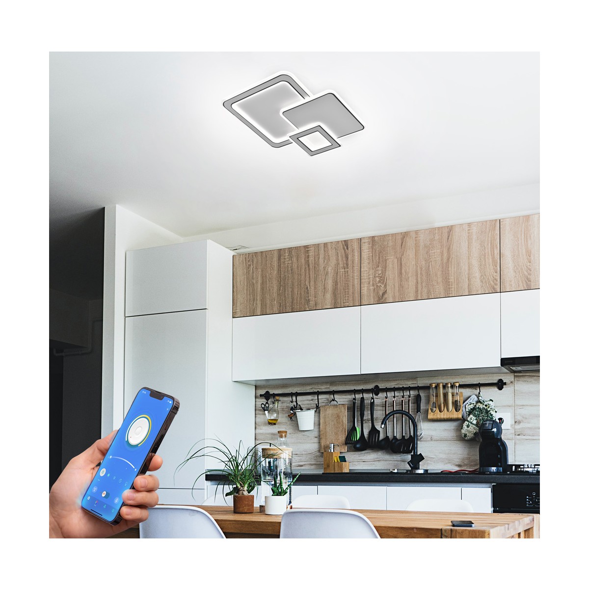 Cora LED ceiling flush light for modern living rooms. Ceiling flush light with three colour temperatures, ideal for use as main lighting in a living room. Modern design with square shapes. Remote control to set different colour tones. You can also control the ceiling light with your smartphone via an app.