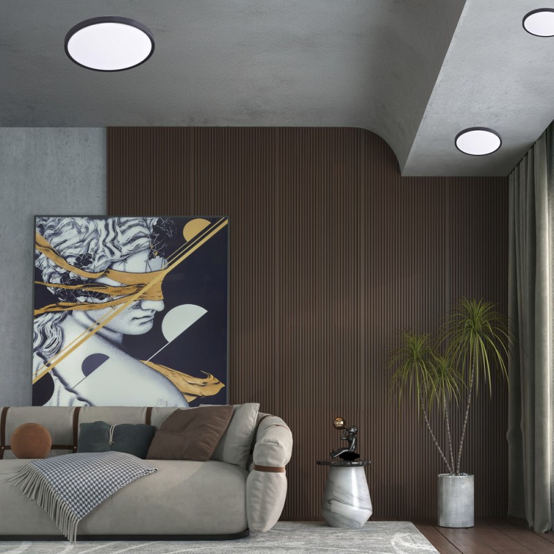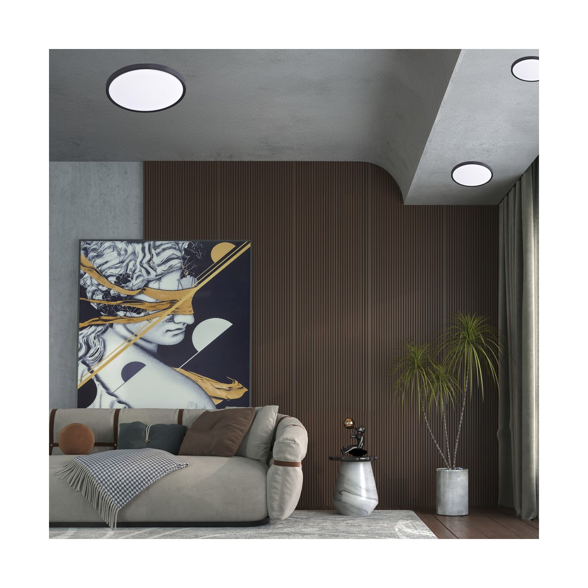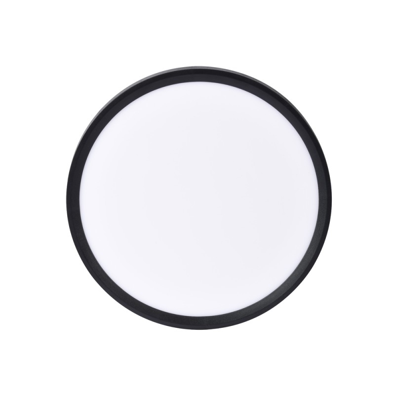 Surface mounted ceiling light with three colour temperatures. Ultra slim circular LED ceiling light perfect for functional lighting of indoor spaces. It has three colour temperatures (3000-4000-6500K)* and three light intensities (10-50-100%)**. Easy installation directly into the ceiling and ultra slim design (25mm). Black aluminium frame and acrylic diffuser.