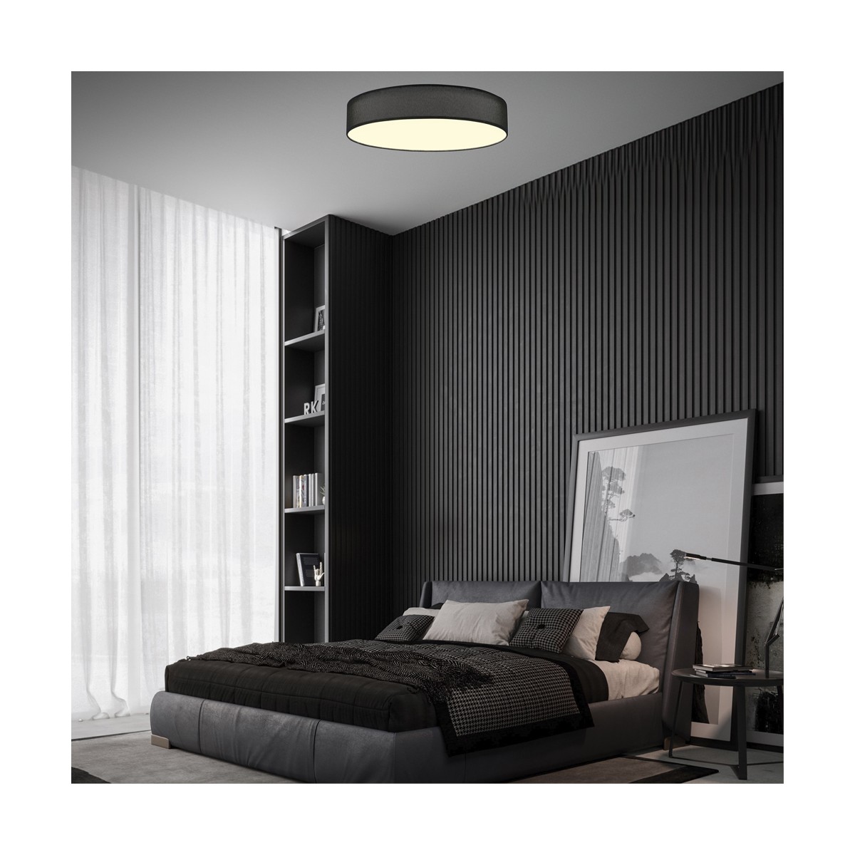 LED ceiling flush light with three colour temperatures*. Boho chic ceiling flush light for lighting living rooms and bedrooms. Circular design 60 centimetres in diameter with black lampshade and pmma diffuser. Its integrated LED lighting is projected in a diffuse way providing an optimal light in the room.