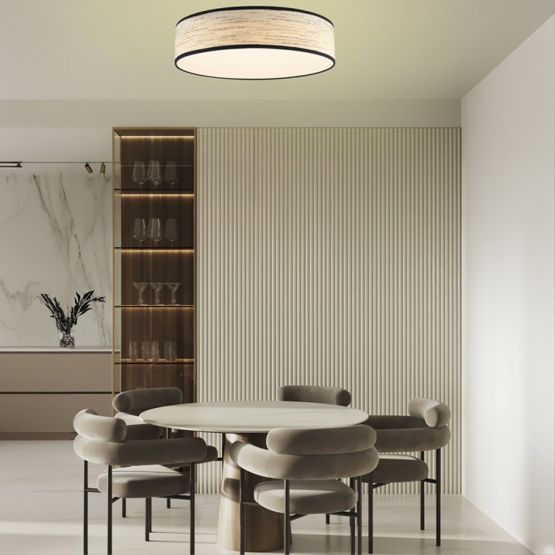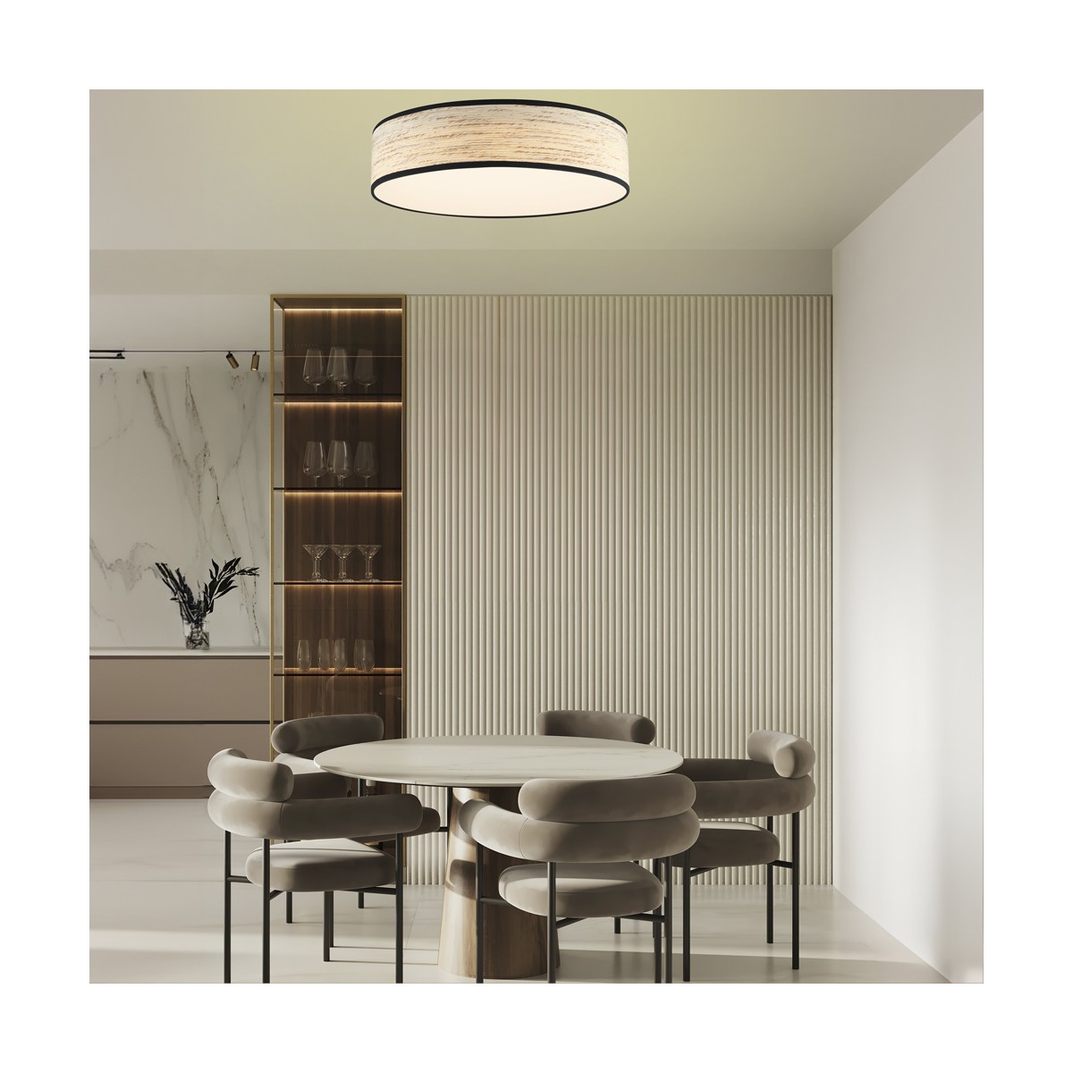 LED ceiling light with three colour temperatures*. Boho chic ceiling lamp for lighting living rooms and bedrooms. Circular design 78 centimetres in diameter with a shade in natural fibre with a light bark effect. Its integrated LED lighting is projected diffusely to provide optimum light in the room.