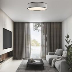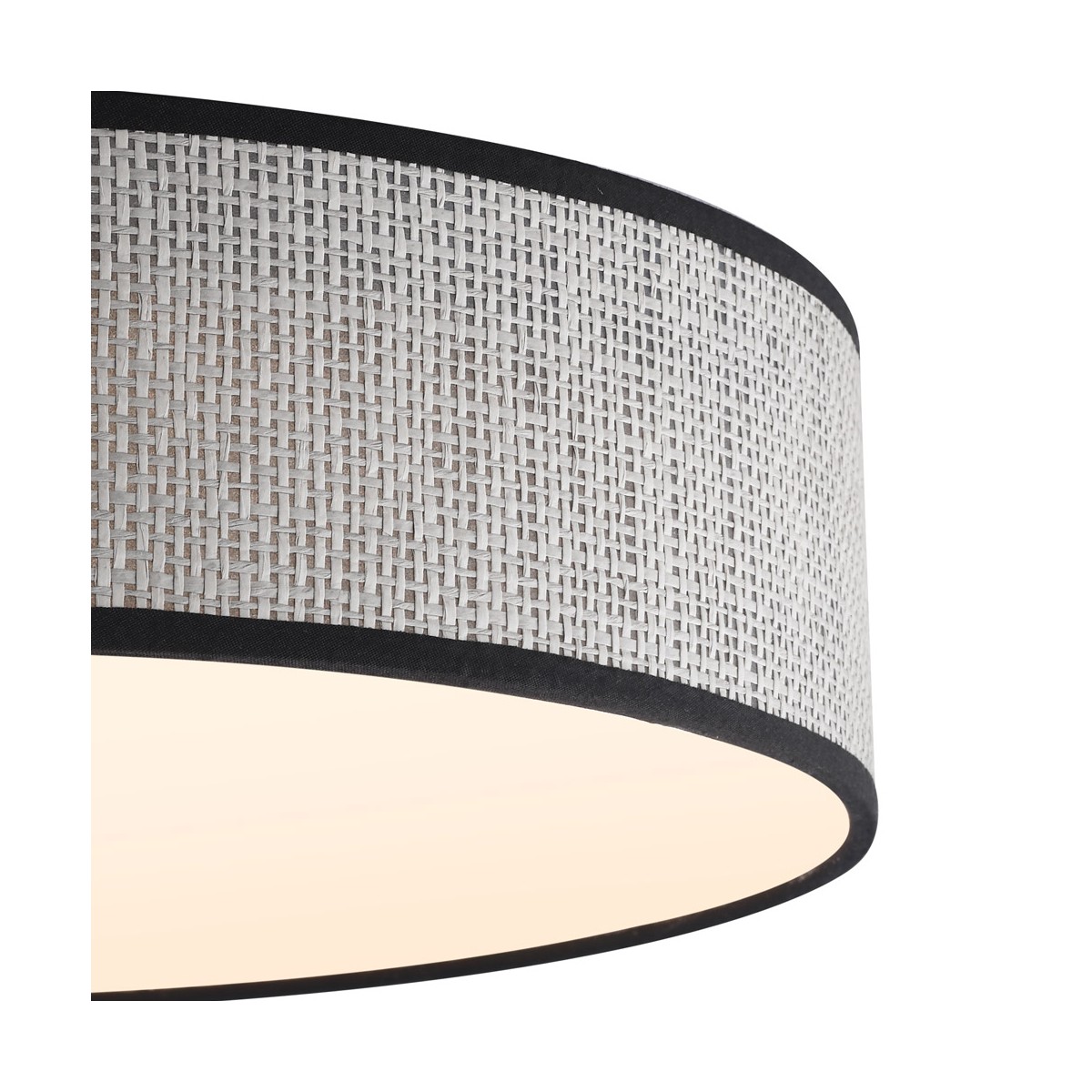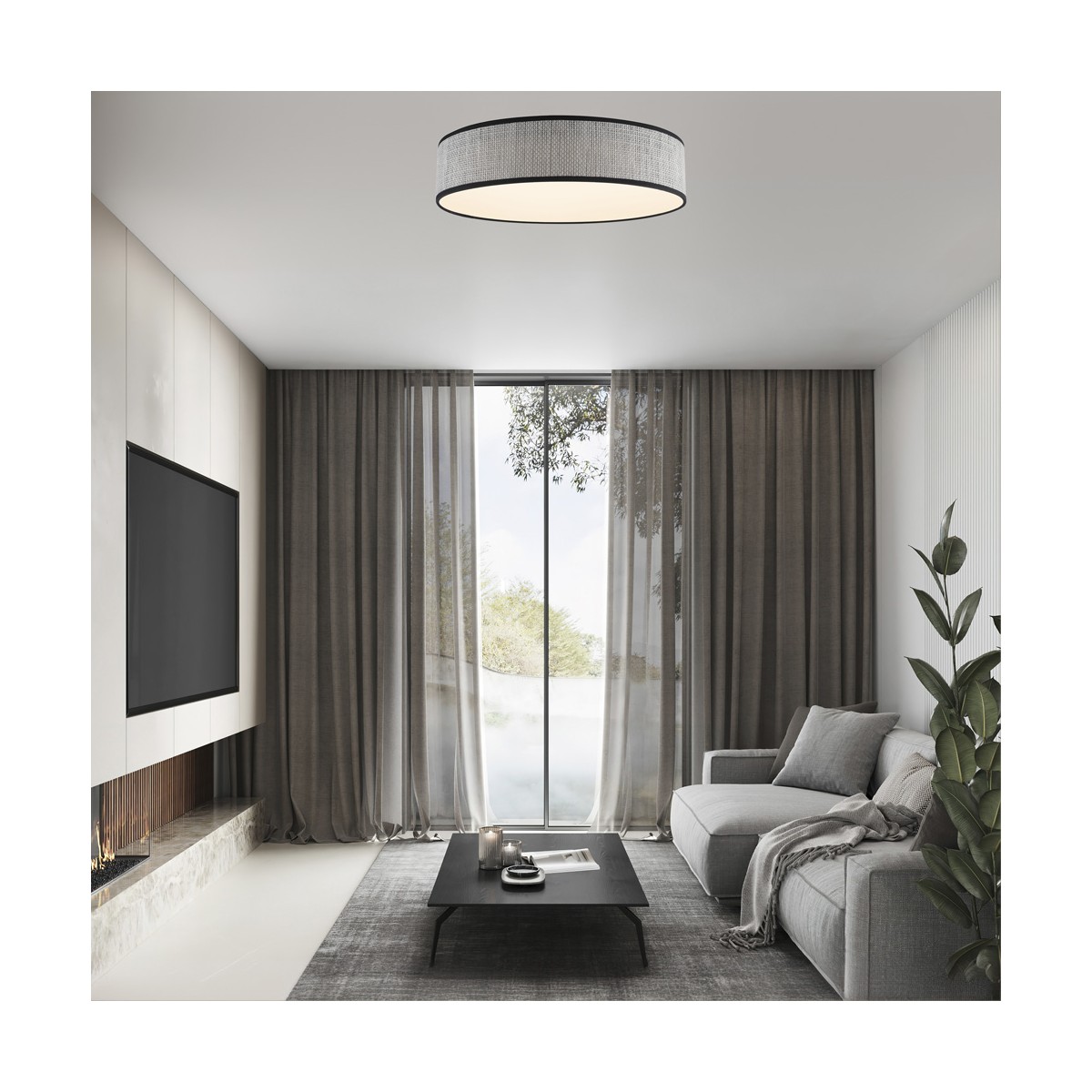 LED ceiling light with three colour temperatures*. Boho chic ceiling lamp for lighting up living rooms and bedrooms. Circular design 78 centimetres in diameter with a shade of interwoven grey fibres. Its integrated LED lighting is projected in a diffuse manner, providing optimum light in the room.